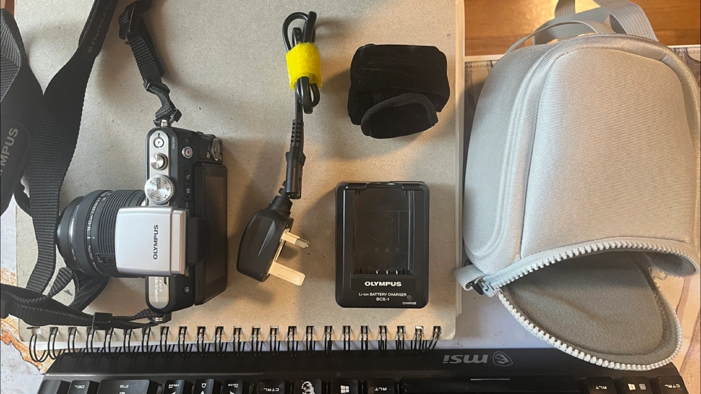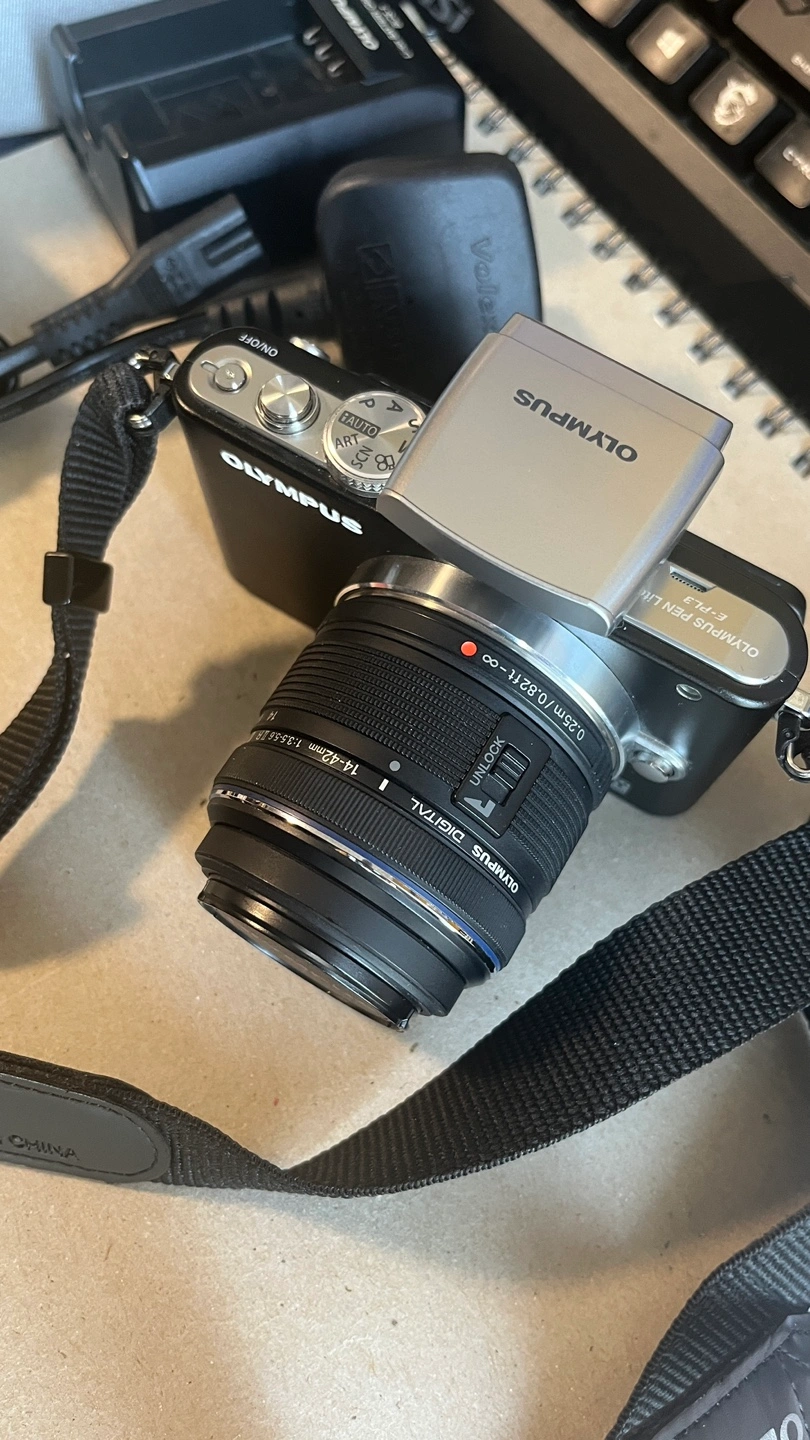 Selling an Olympus E-PL3 camera. It comes with a 14-42mm lens and includes the battery charger (BCS-1), a carrying case, and a wrist strap.