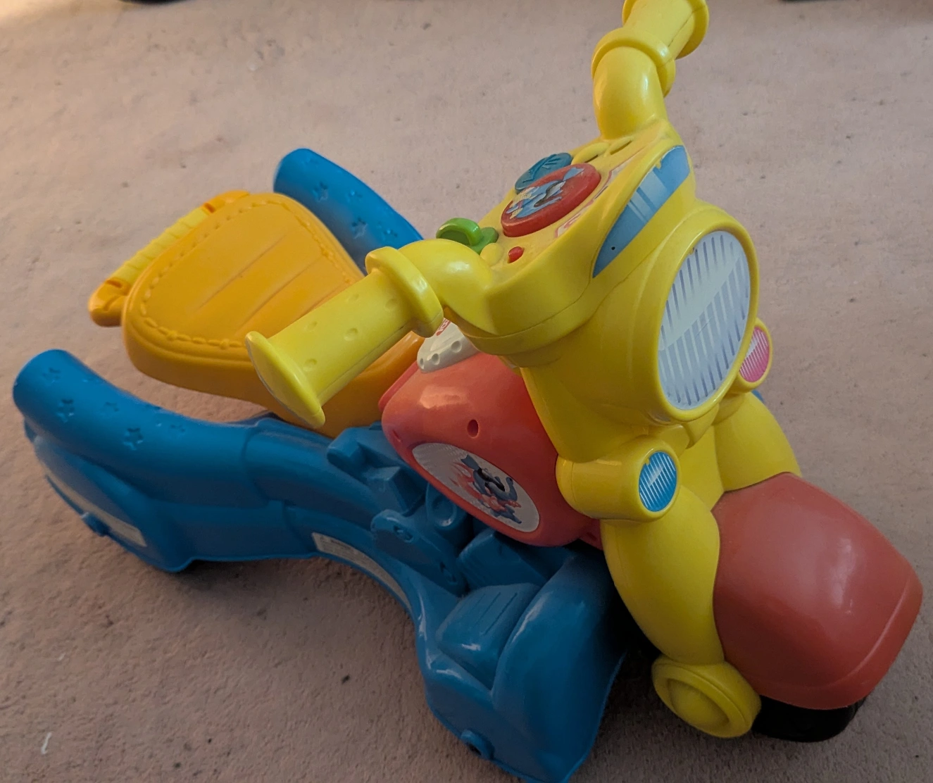 Here's a Fisher Price Motorcycle in great condition! It's perfect for toddlers and young kids to go around and keep them moving! The bright colours and interactive features and sounds make it super engaging. It's a fun way to encourage active play and develop endurance and fitness.