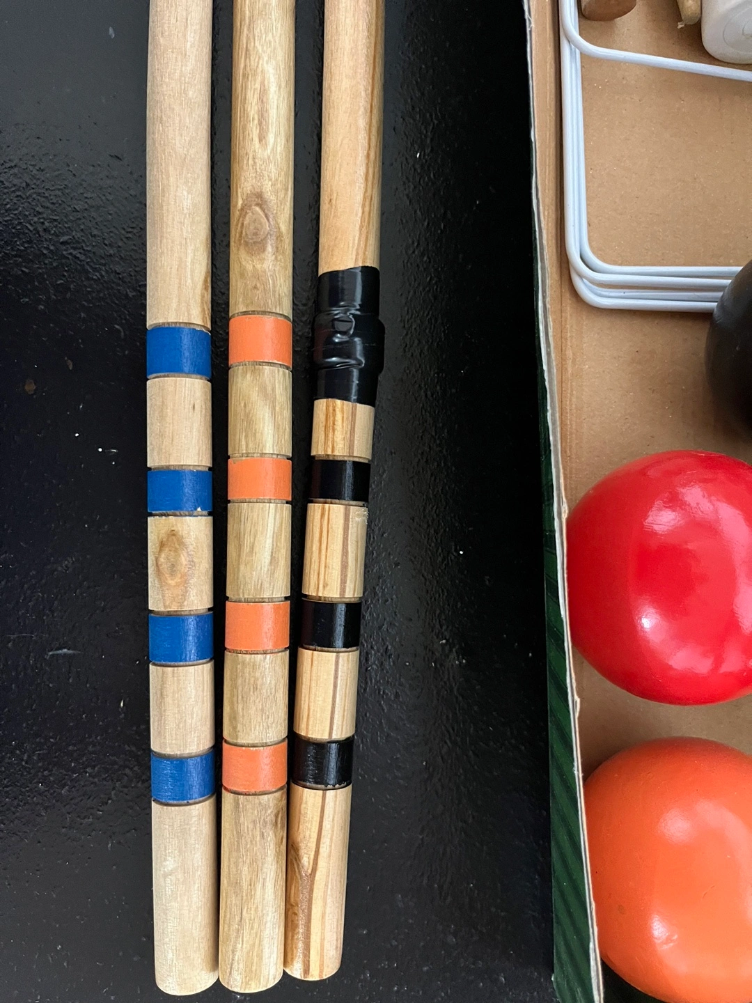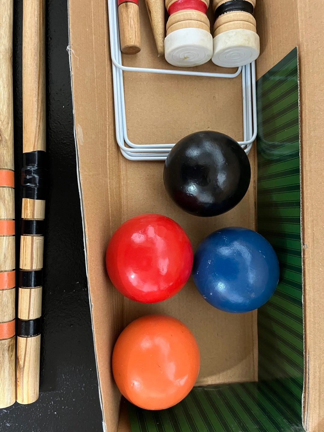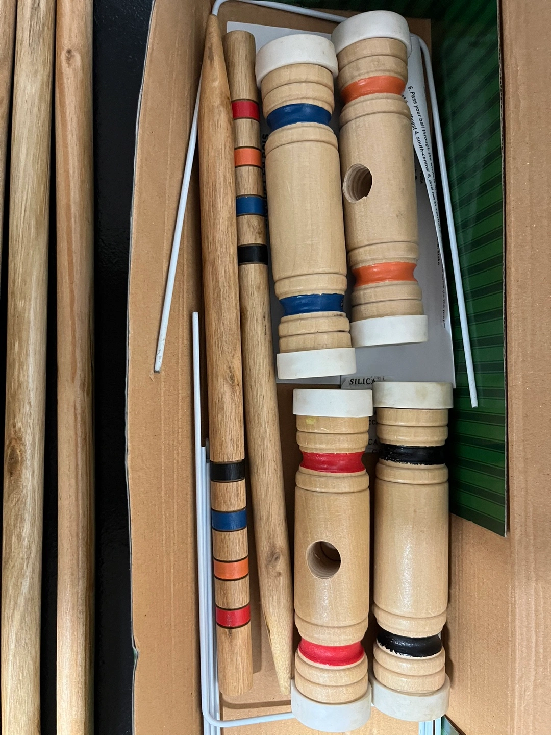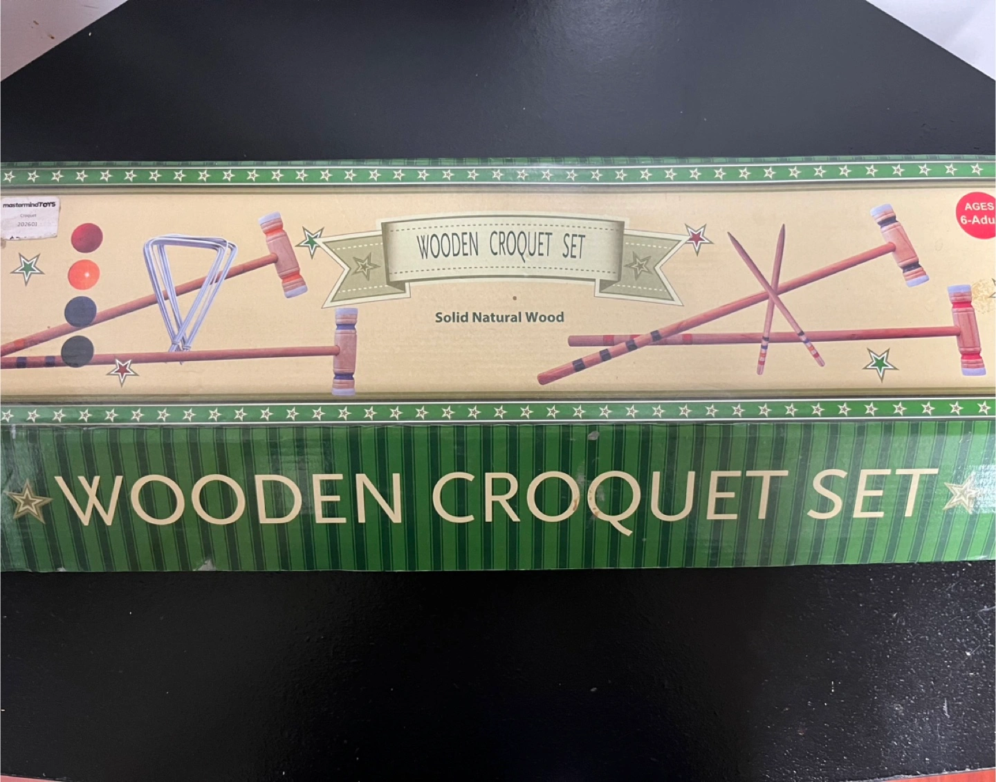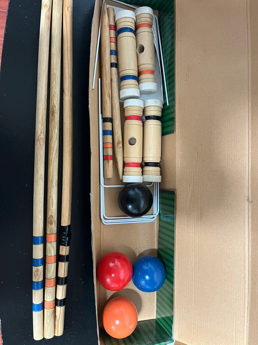 Selling a wooden croquet set made of solid natural wood! Comes with all the pieces shown in the box. Great for some outdoor fun with family and friends