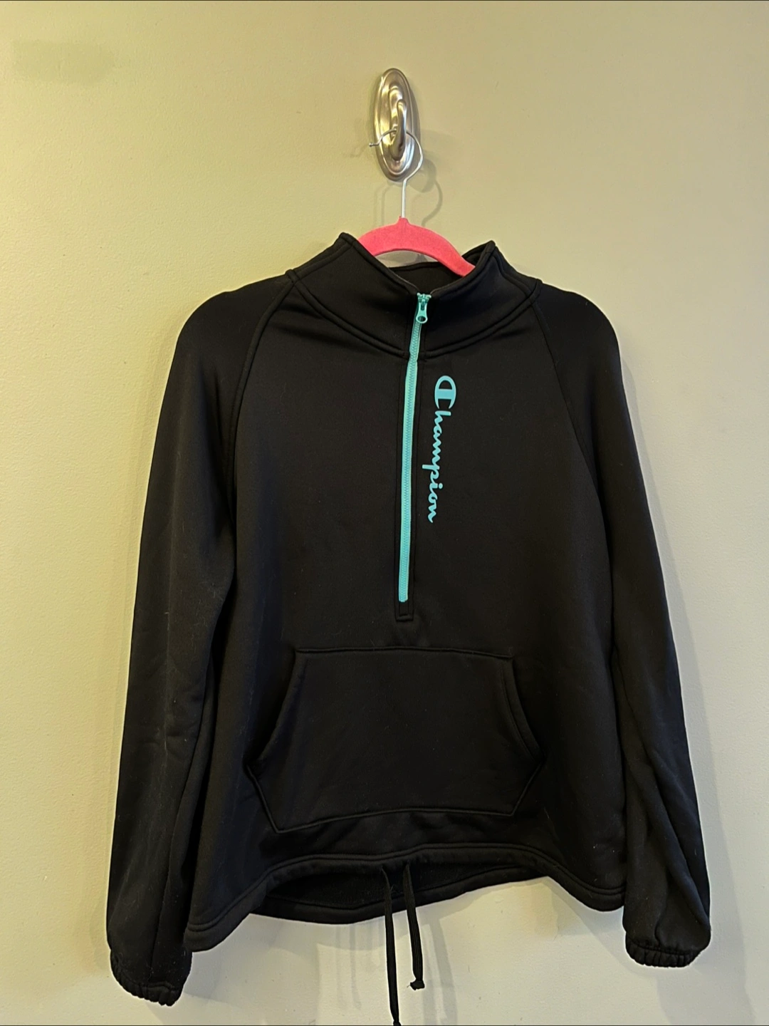 Cozy Champion black pullover in size large. It features a quarter zip with a cute turquoise accent and cinching strings at the bottom.