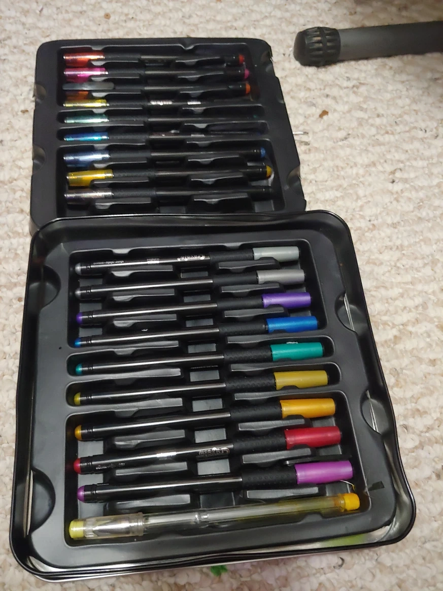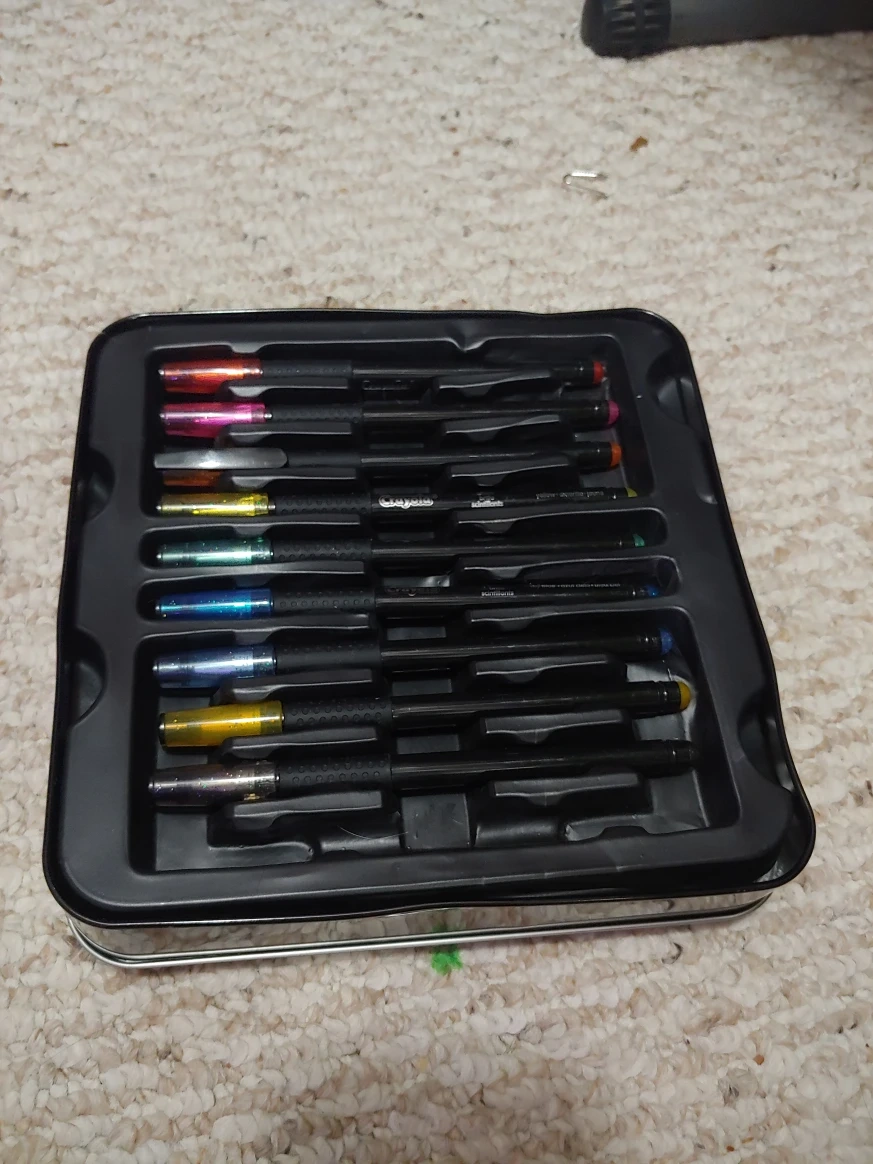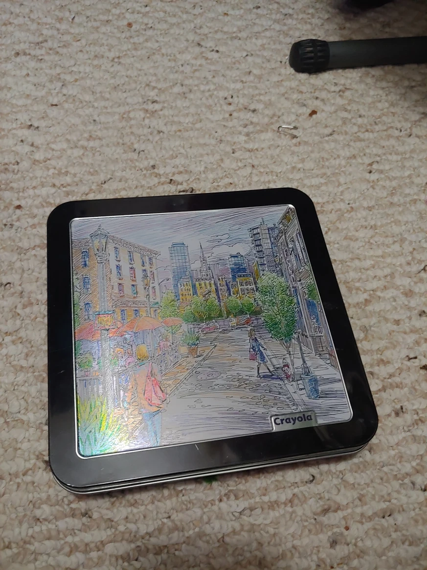 Selling a set of Crayola Signature Fineliner Markers. It comes in a tin case with a picture of a city on it. Great for drawing and writing!