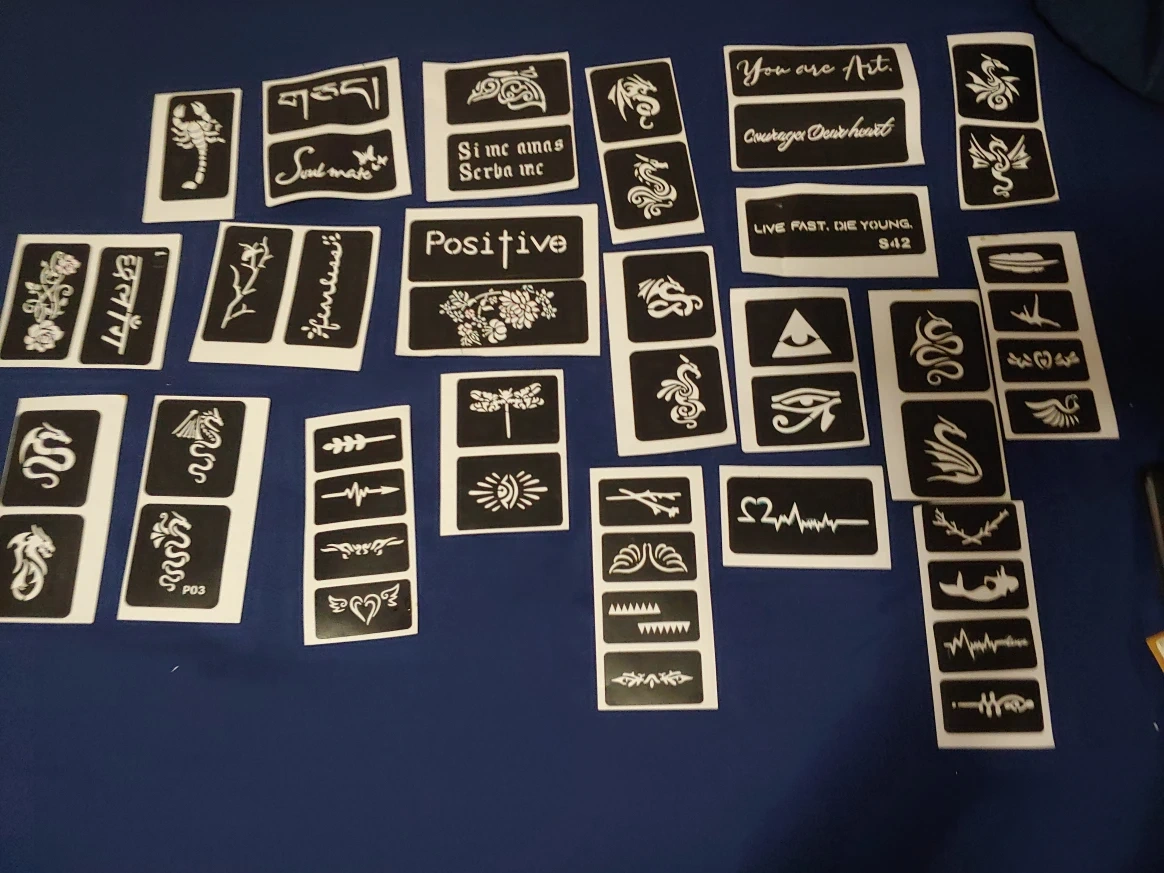 Selling a collection of henna tattoo stencils with various designs. These stencils feature a mix of symbols, patterns, and inspirational phrases like 'You are Art' and 'Live Fast Die Young'. Great for creating temporary tattoos!