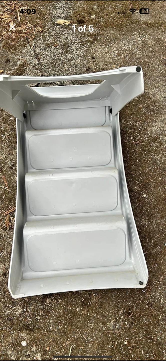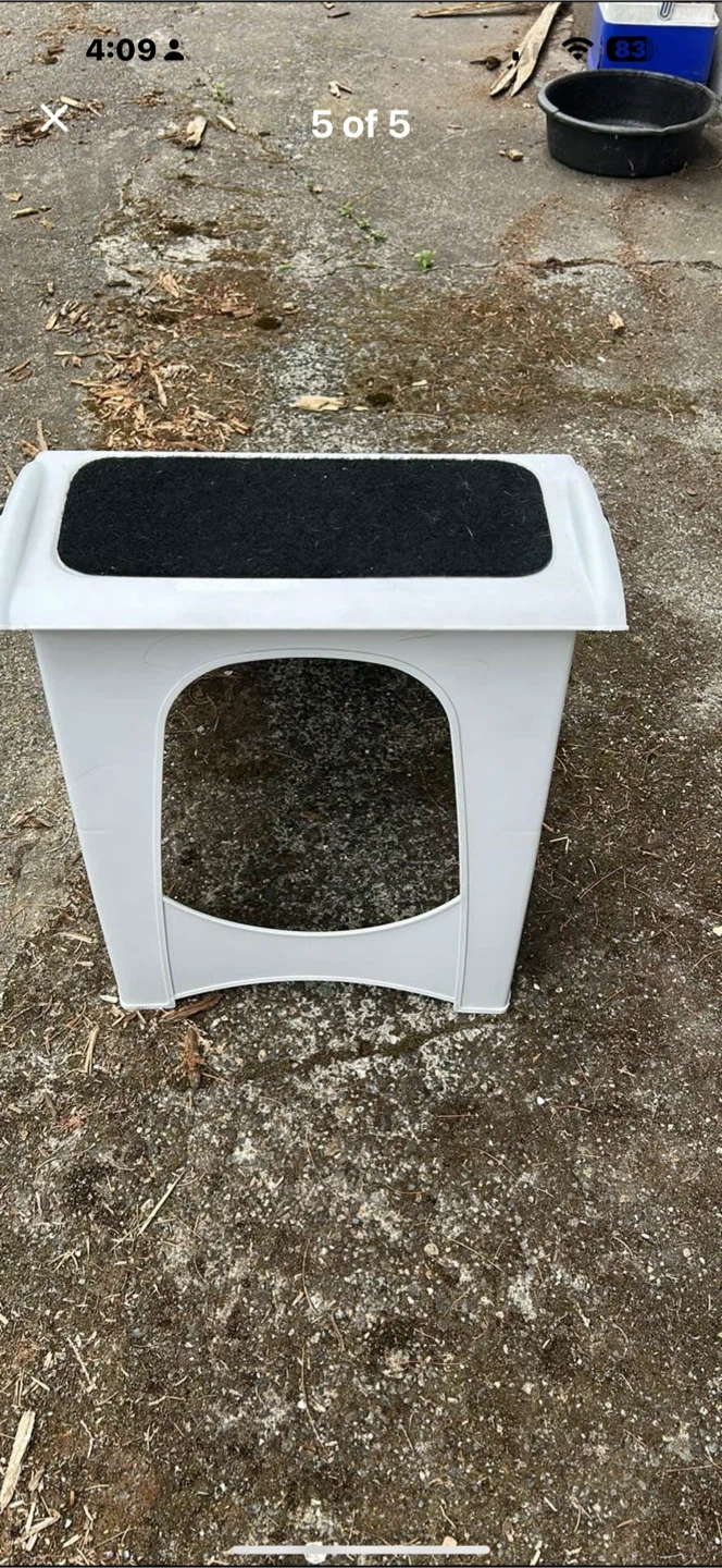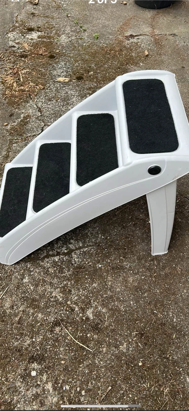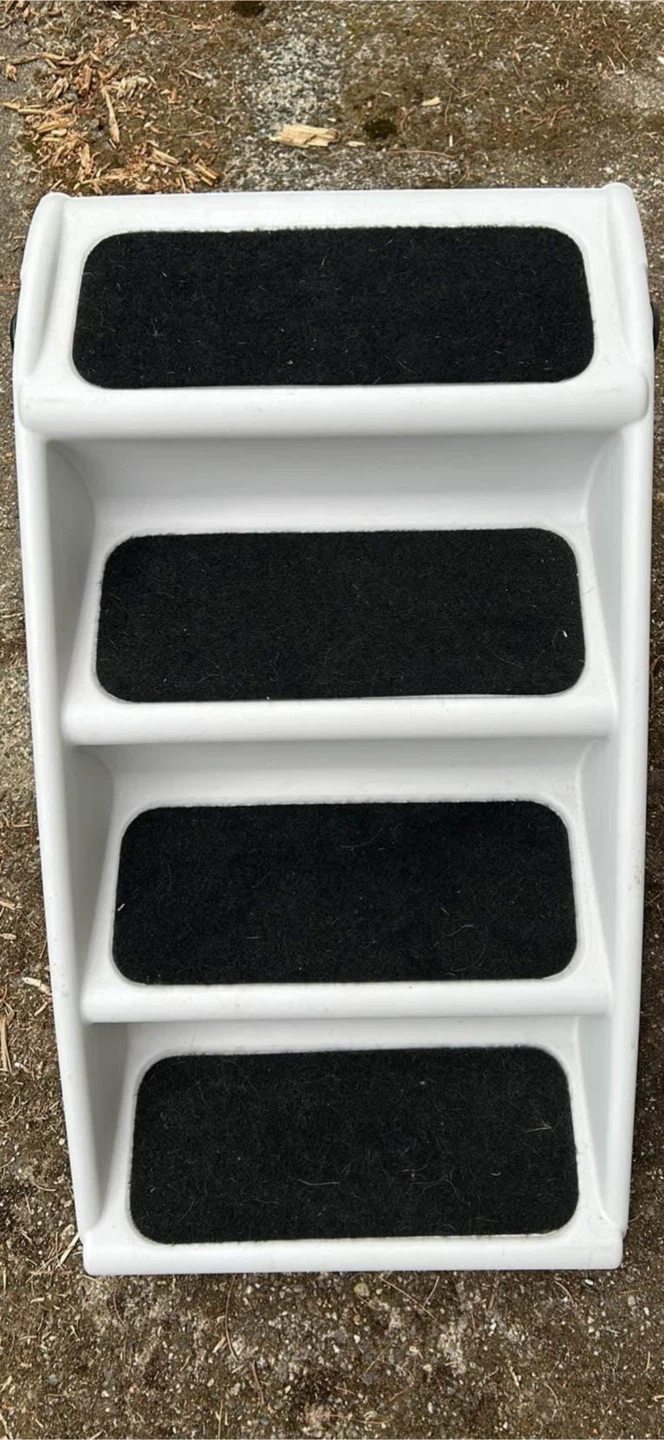 Here are some pet steps in great condition! They are white and have a black carpet on each step. Perfect for helping your furry friend reach higher places with ease