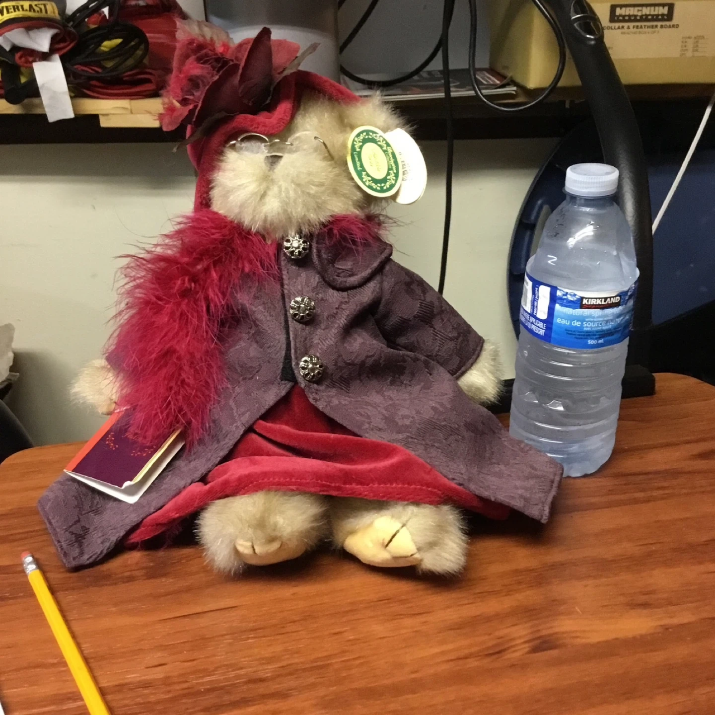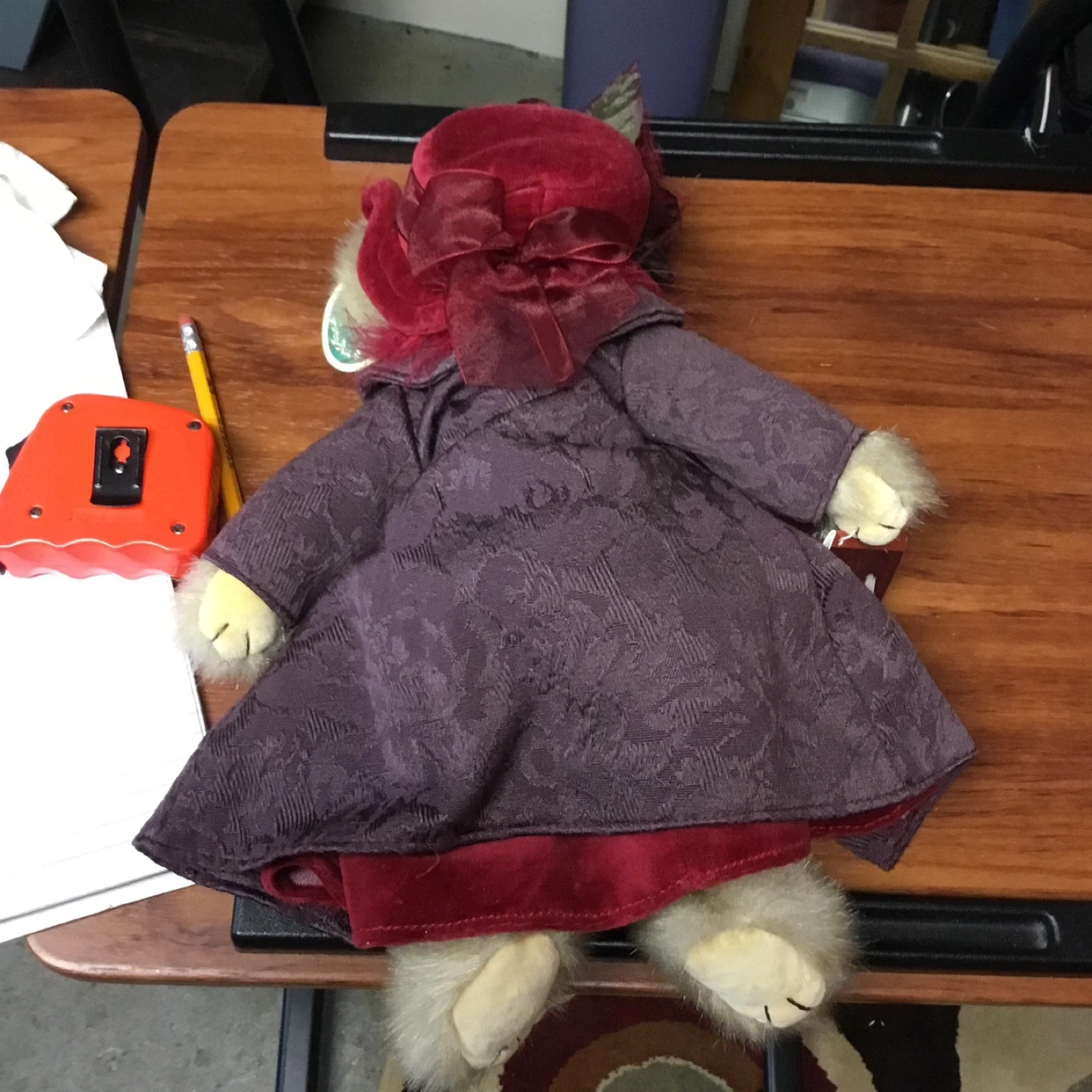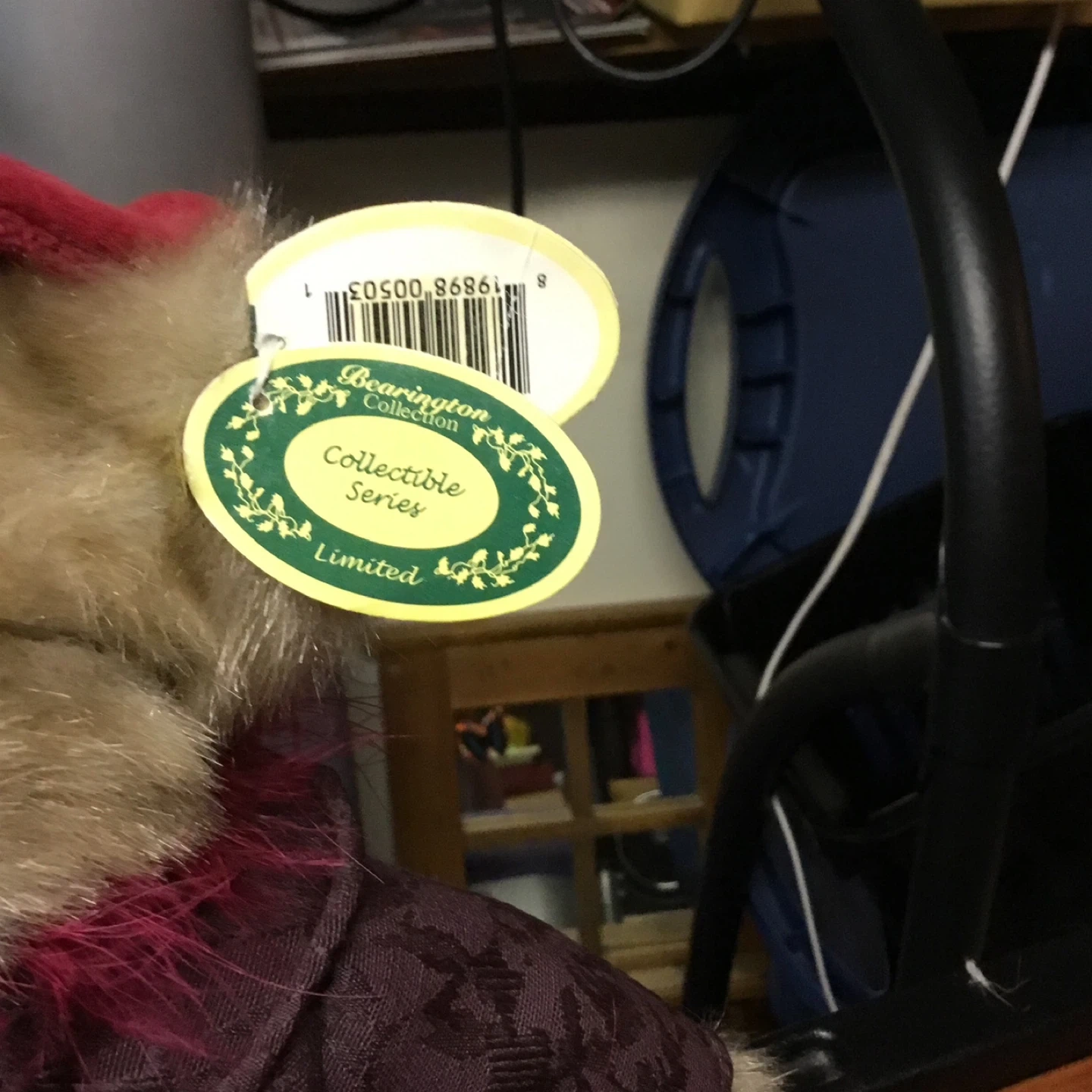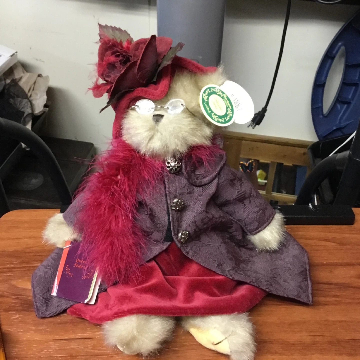 This adorable Bearington Collection bear is part of the Collectible Series and is a limited edition! It's dressed in a lovely outfit with a red hat, purple coat, and red dress. It even has glasses! A sweet addition to any collection