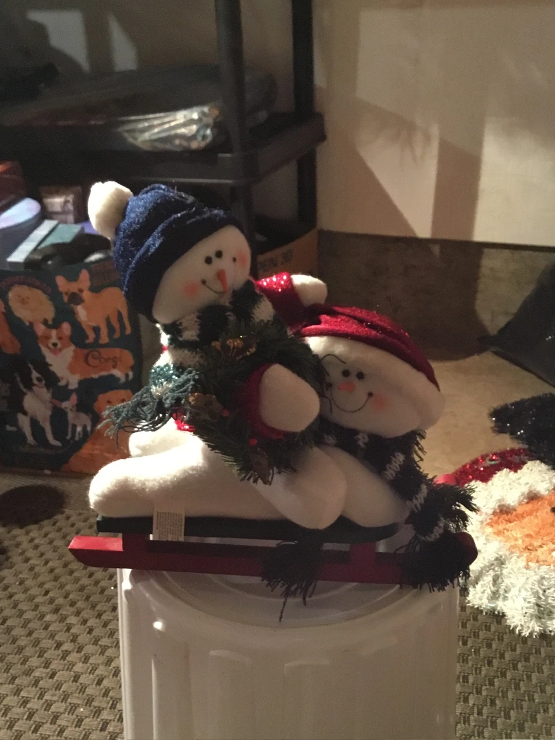 A cute snowman couple riding on a sled decoration! Perfect for adding a touch of winter charm to your home this season