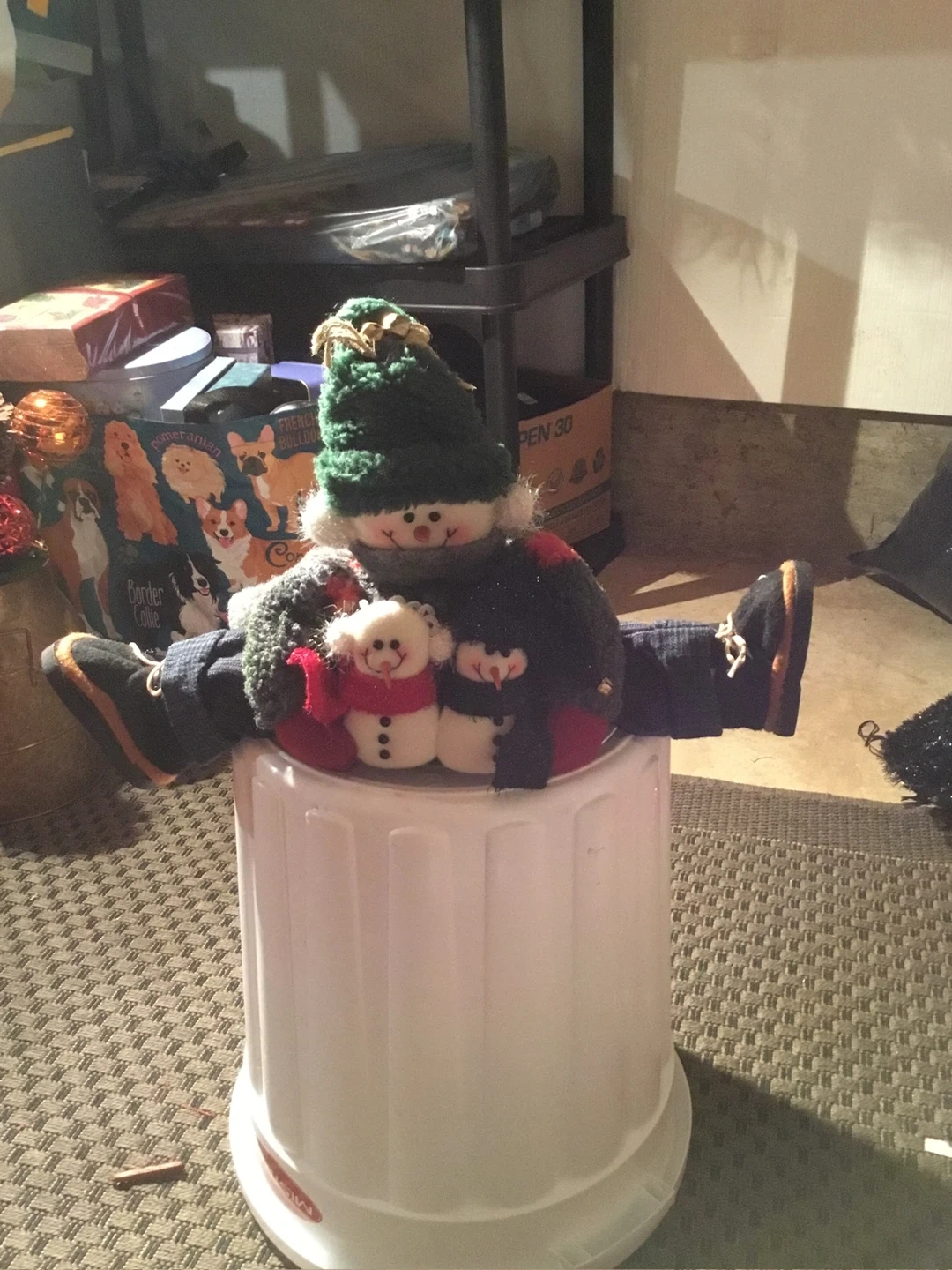 A cute Christmas elf decoration with a green hat and snowmen details! It's sitting on a white stool.