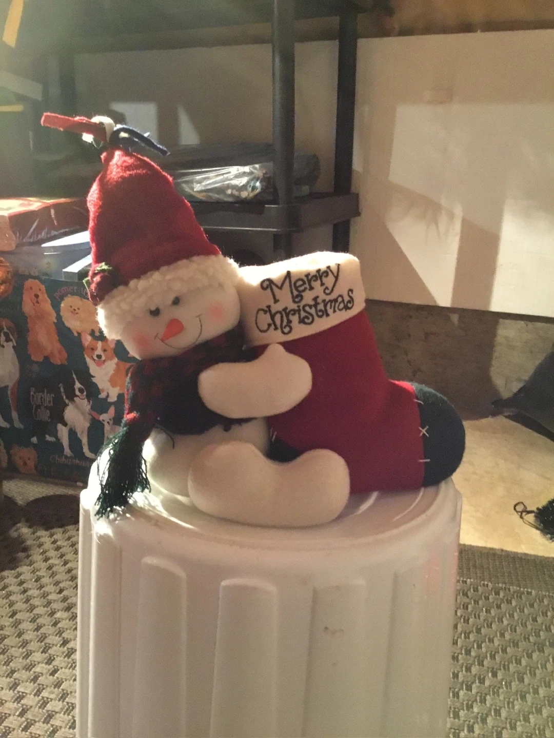 A cute Christmas snowman plush toy holding a red stocking with 'Merry Christmas' embroidered on it! Perfect for holiday decor