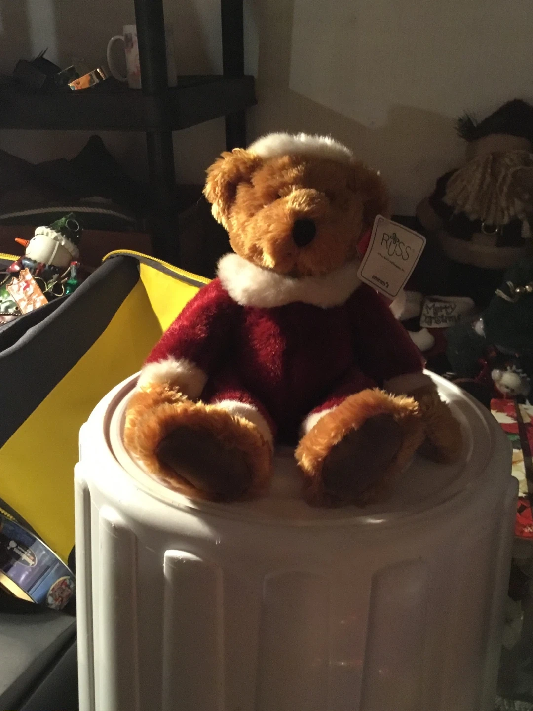 A cute Russ Berrie teddy bear dressed in a Christmas outfit! It's in great condition and ready to spread some holiday cheer