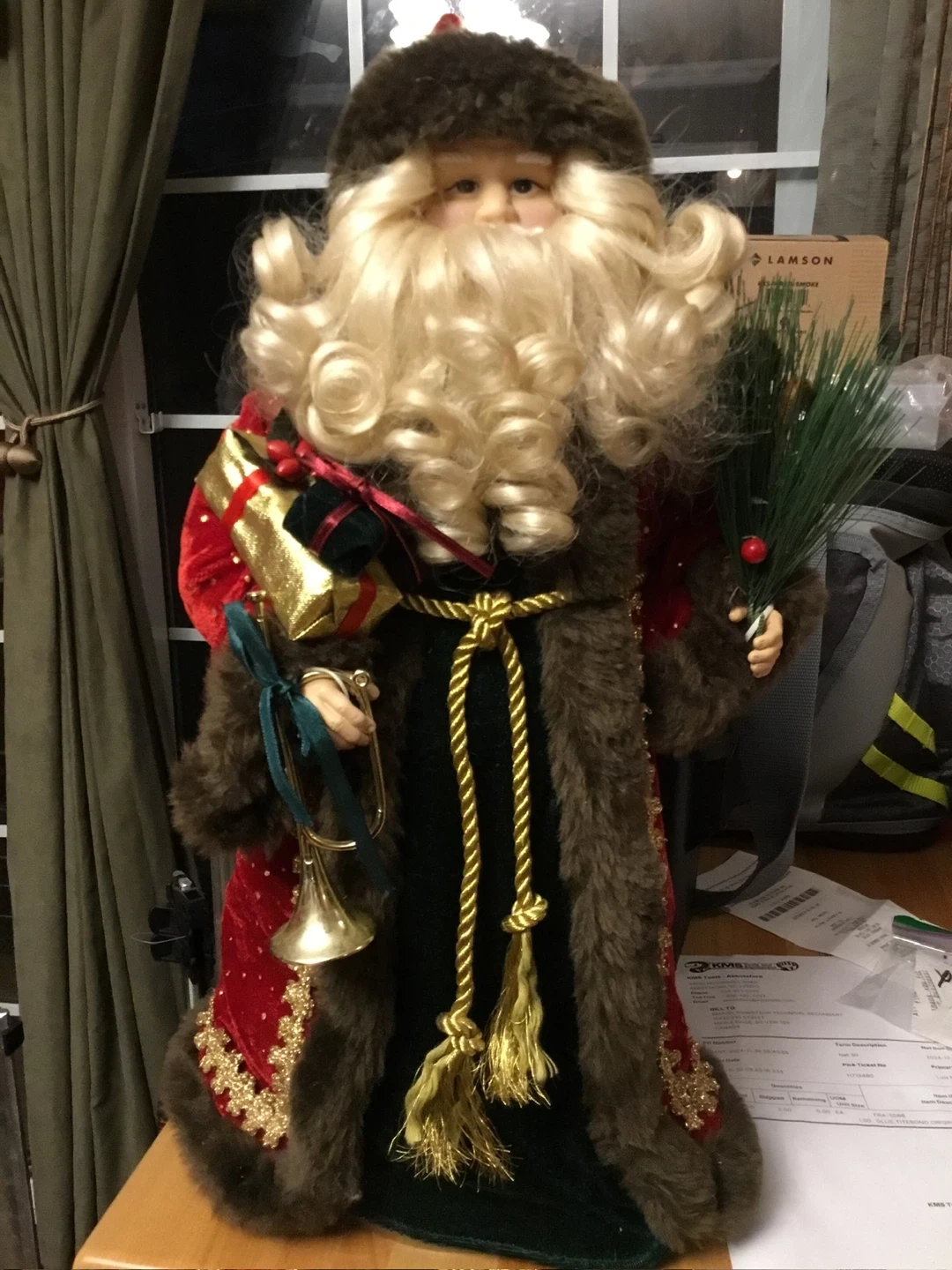 Selling a Santa Claus figurine, complete with a fur coat, festive red and gold accents, and a decorative horn. This charming piece is perfect for adding a touch of holiday cheer to any space!