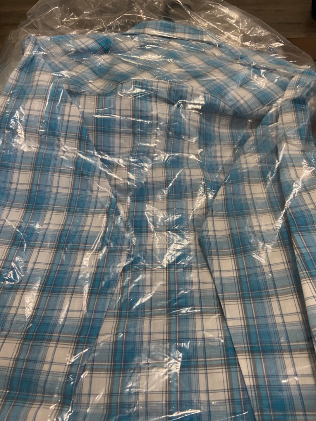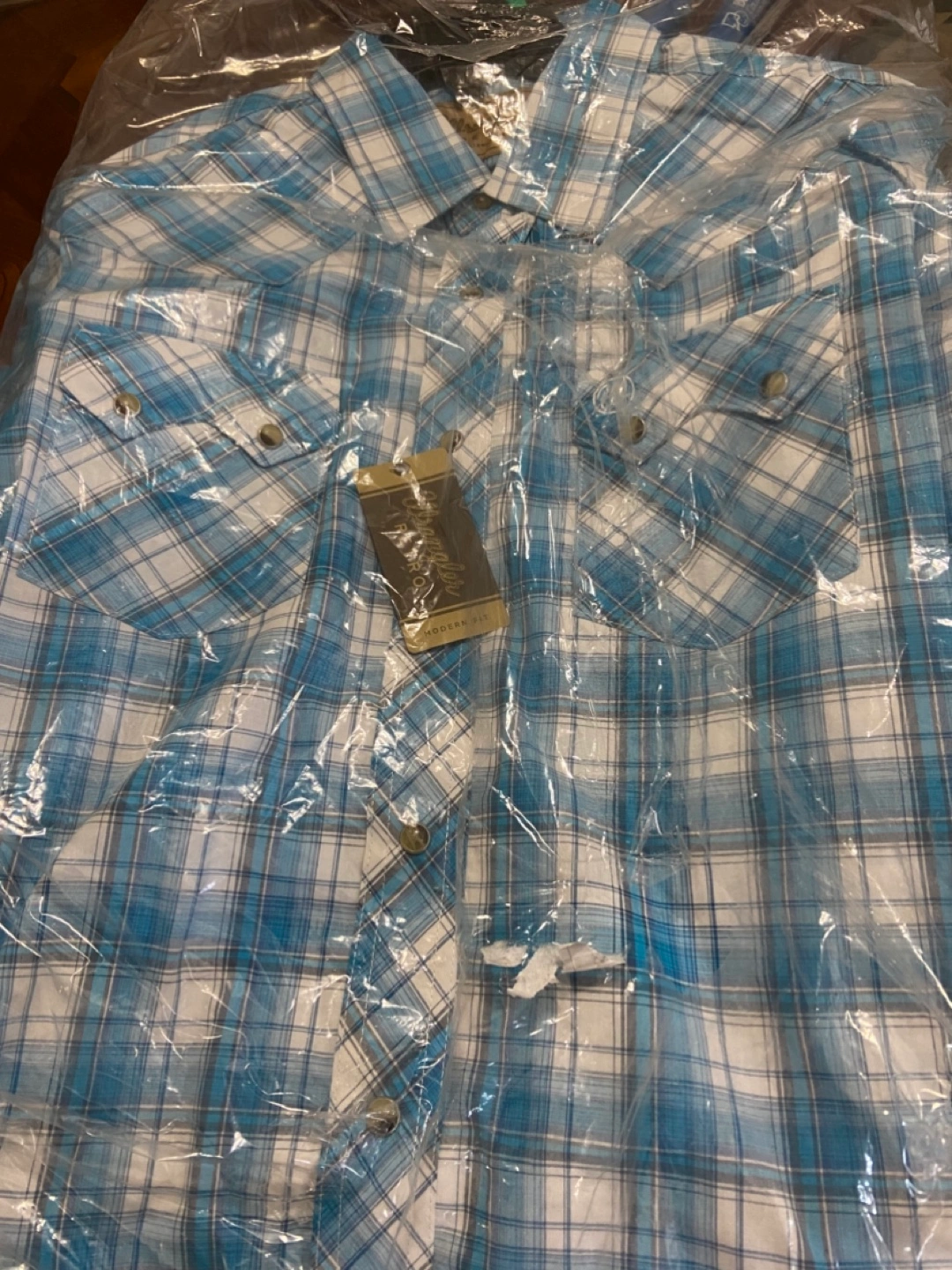 A Modern Fit Western Shirt in a lovely blue plaid pattern . Brand is Wrangler anf retails for more than 50/-