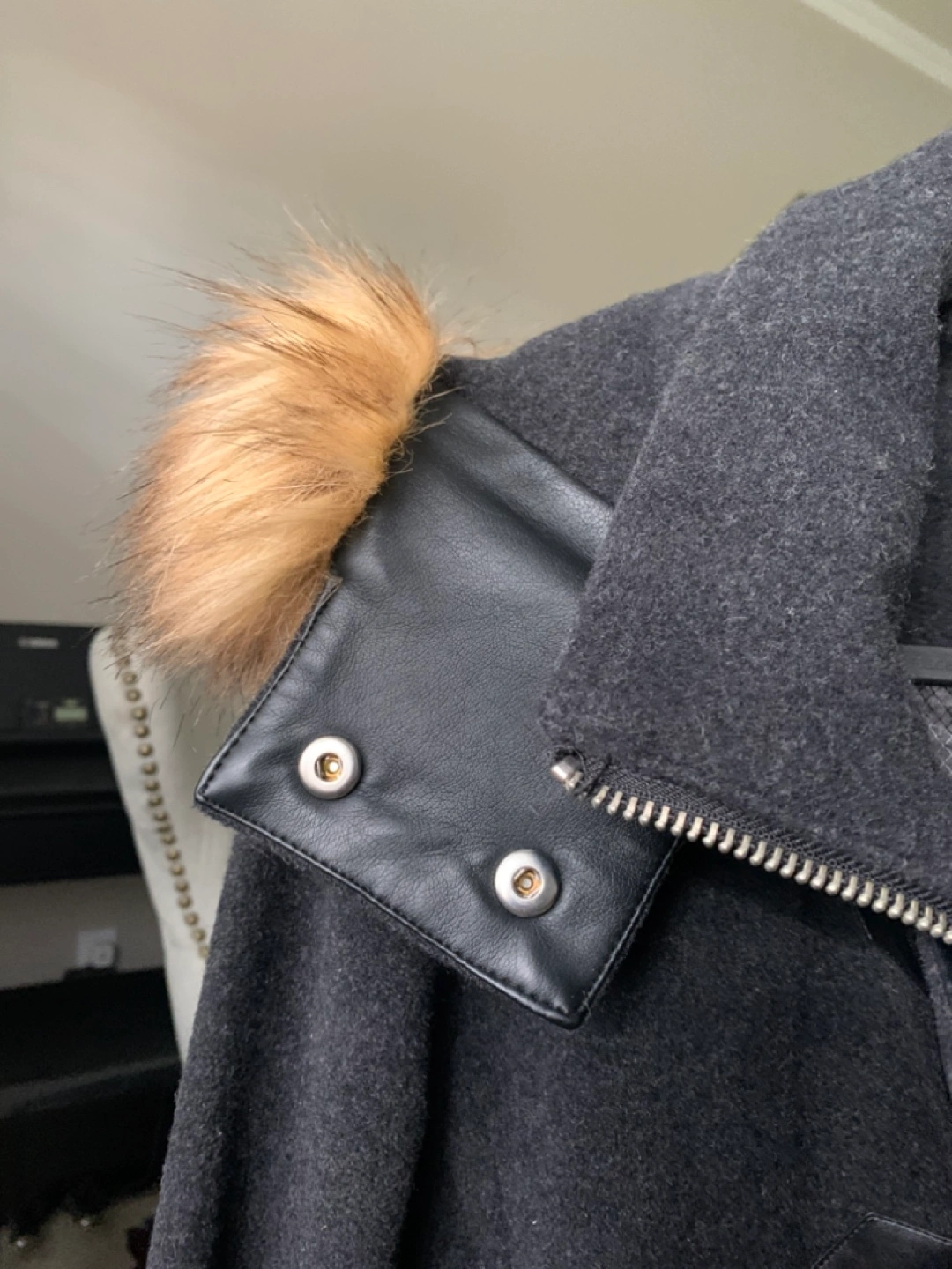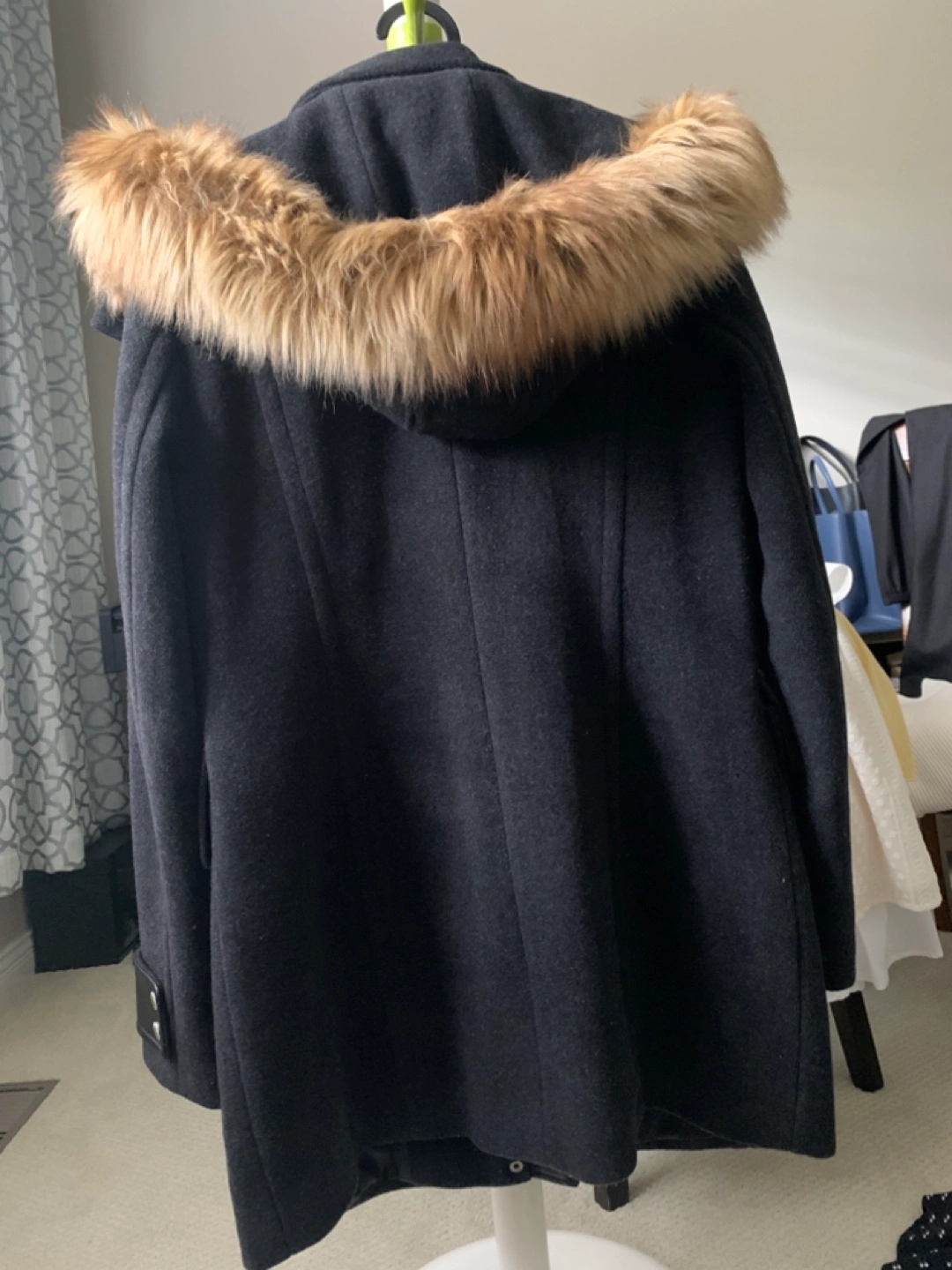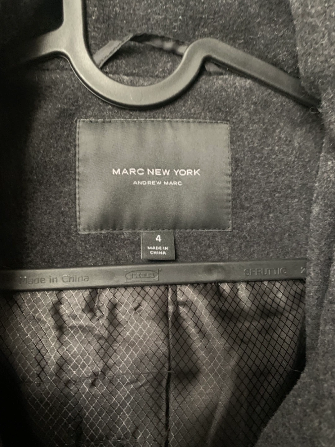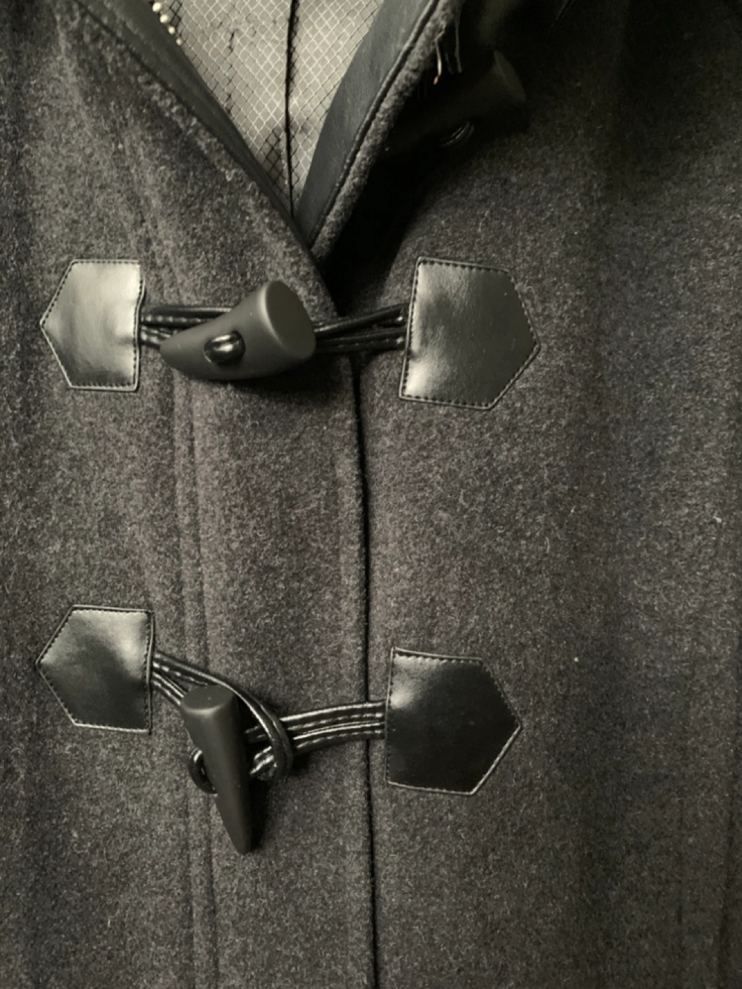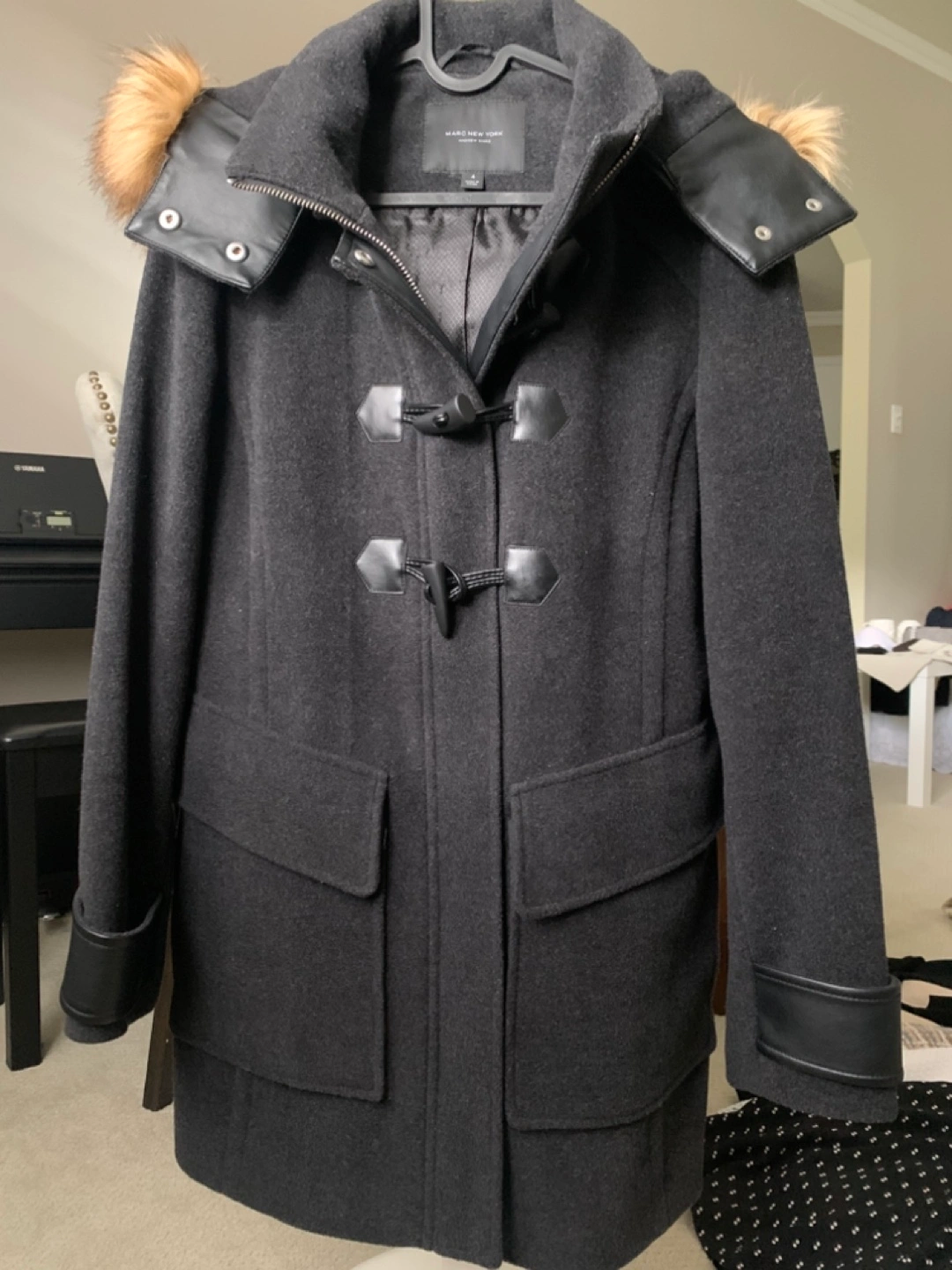 Here's a stylish Marc New York duffle coat, perfect for staying warm this season! It features a wool blend material, giving it a classic and cozy feel. The coat is a sleek grey colour and has toggle closures, adding a touch of sophistication to your outerwear collection