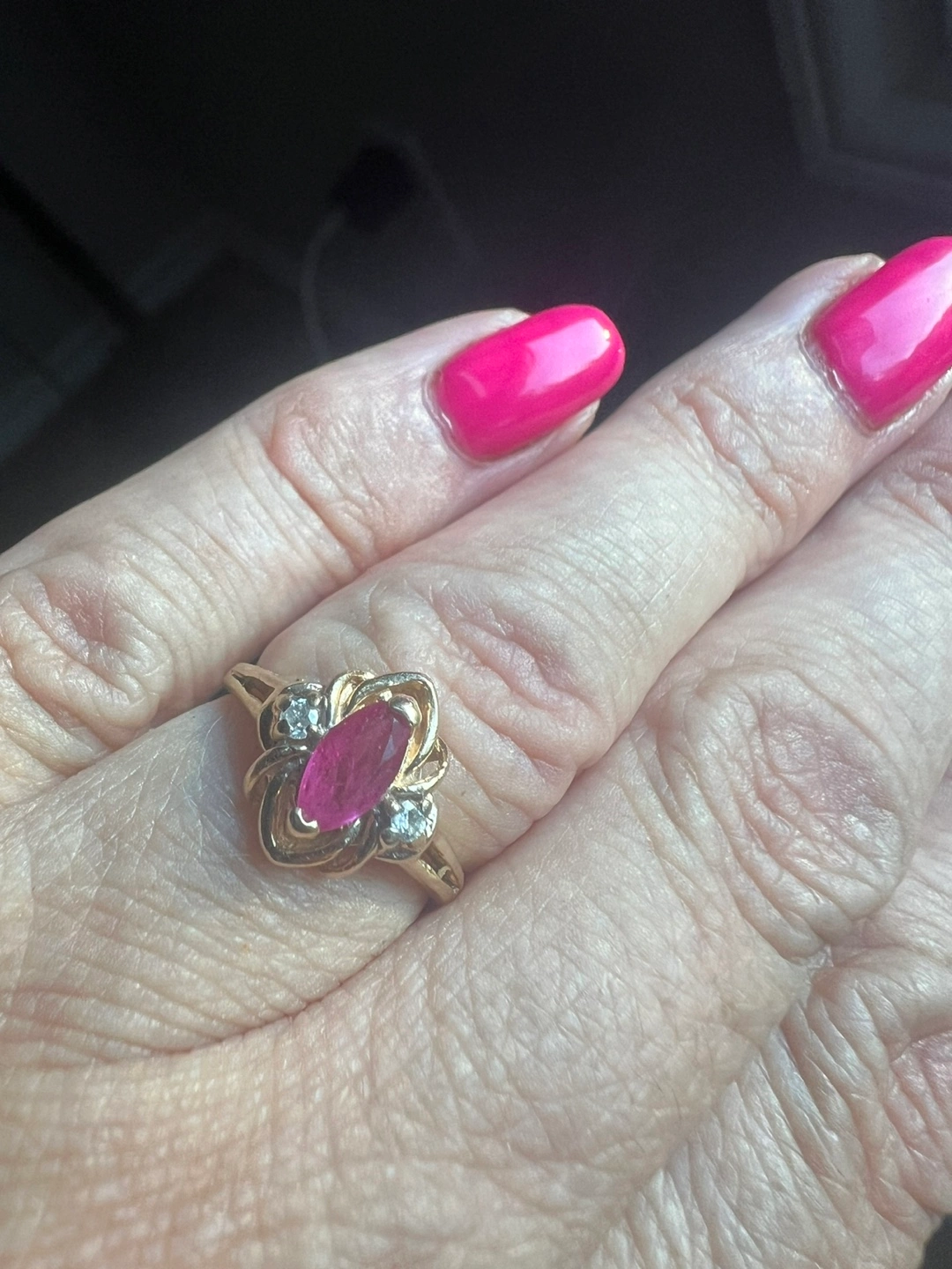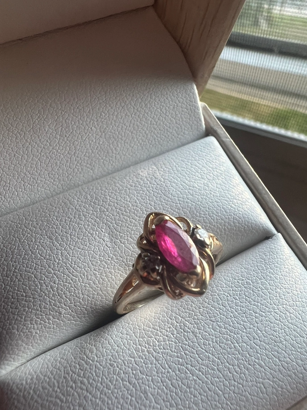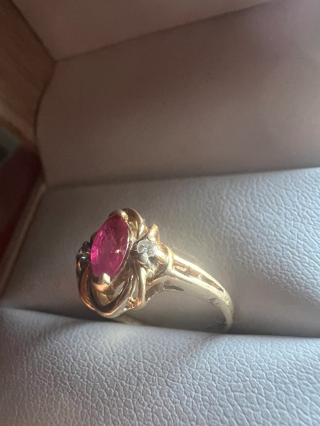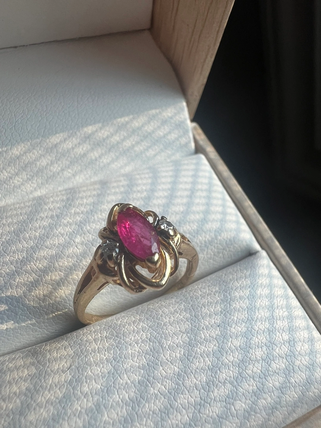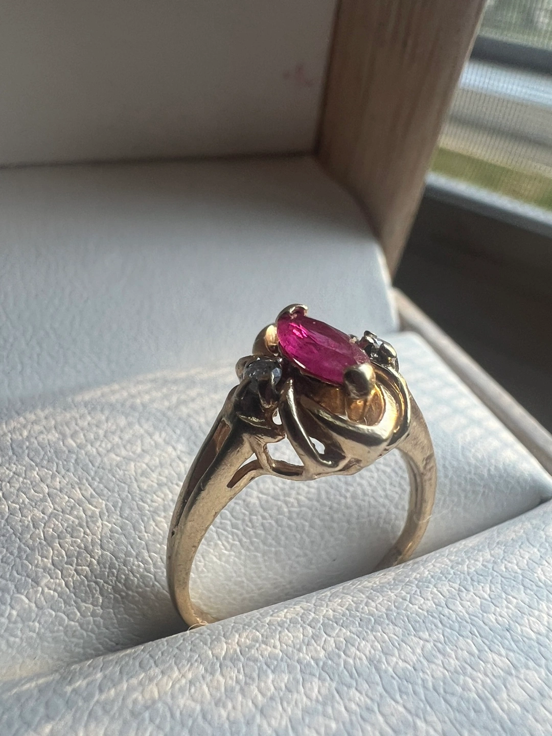 Selling a beautiful vintage 10 k gold ring featuring a ruby and small diamonds. It's in great condition and would make a lovely addition to any jewellery collection! Size 4-4.5