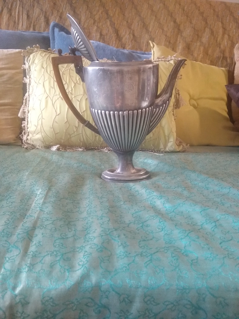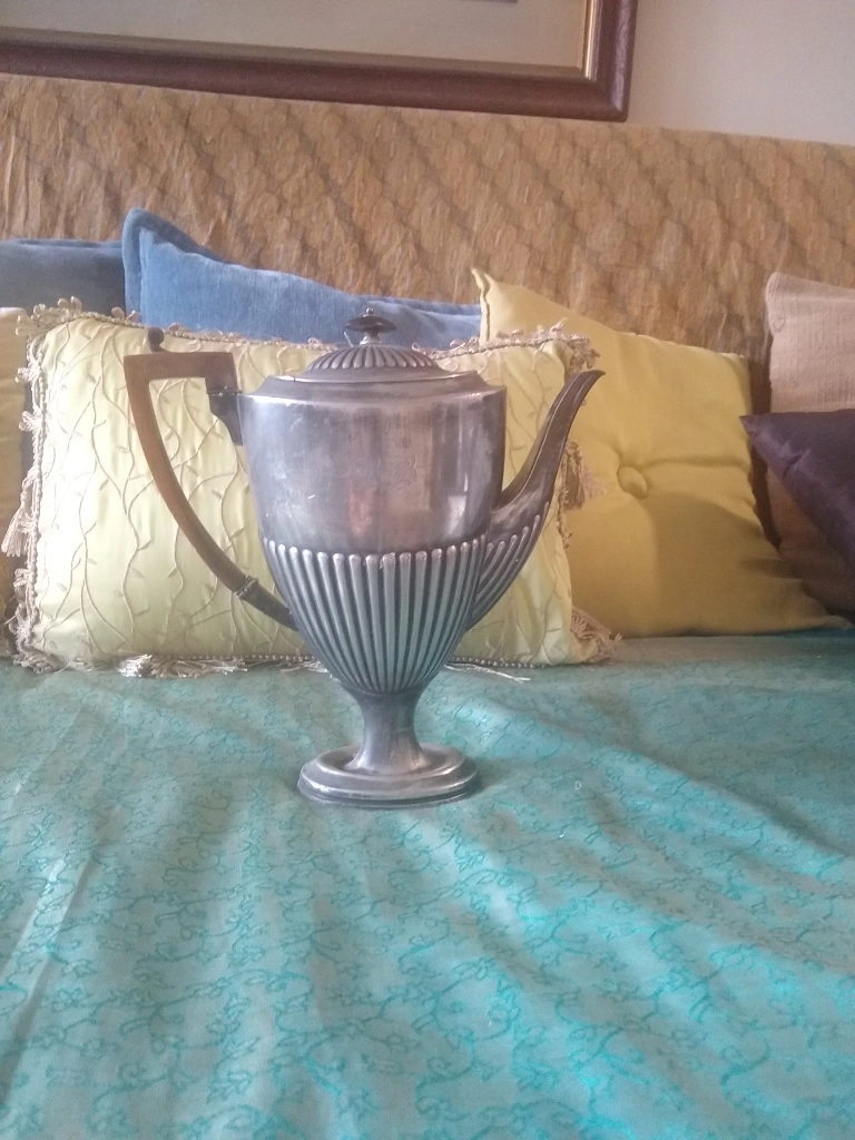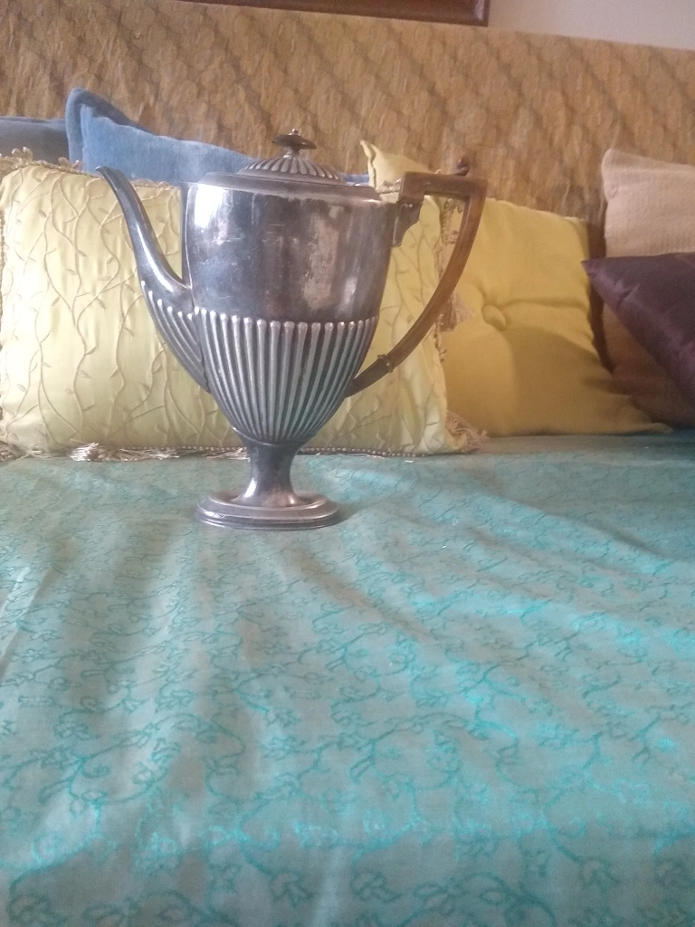 Selling a vintage silver plated teapot. It has a unique design with a wooden handle and ribbed detailing on the base. It's in good condition for its age, with some wear that adds to its vintage charm. Perfect for tea lovers or as a decorative piece!