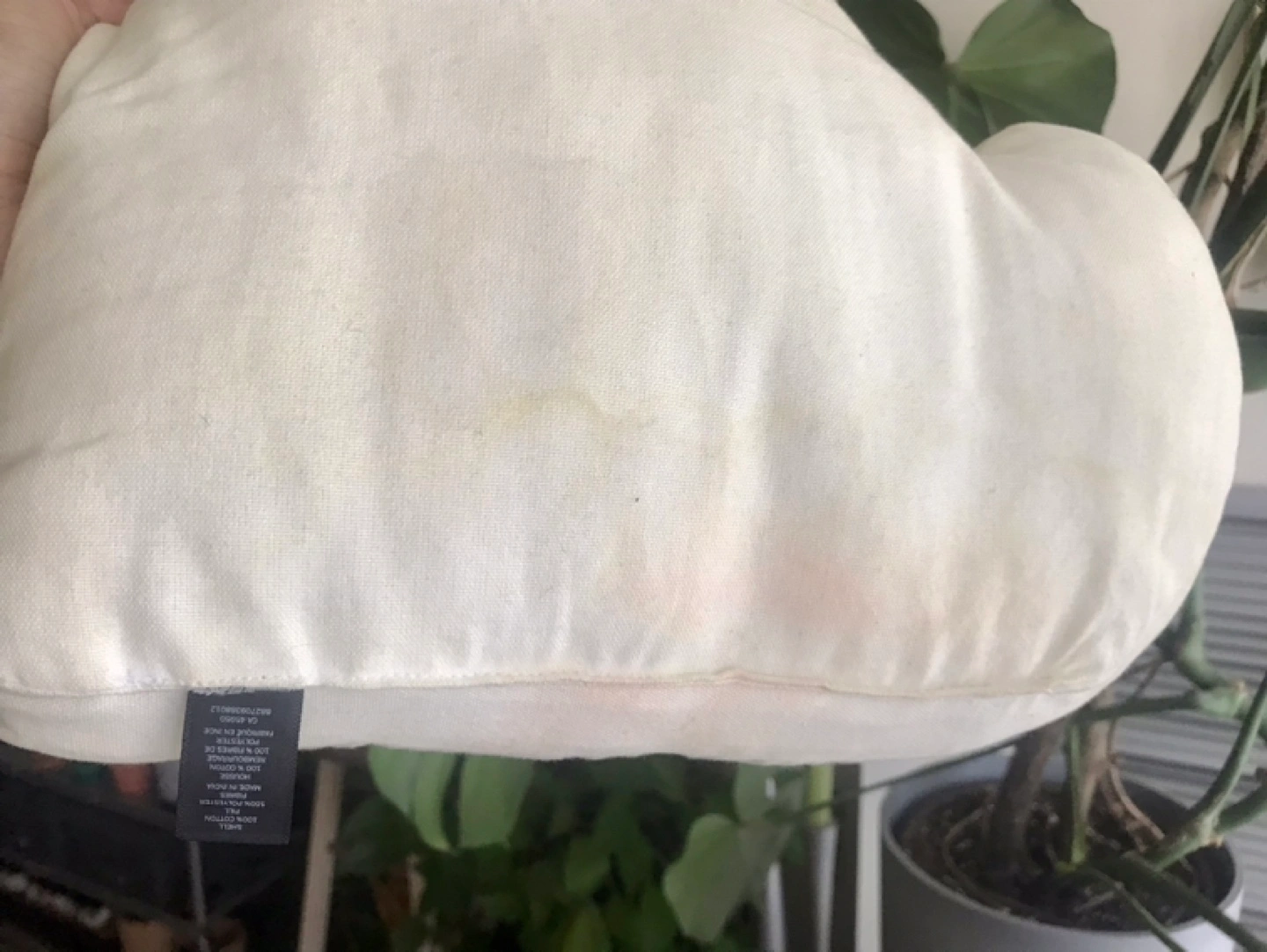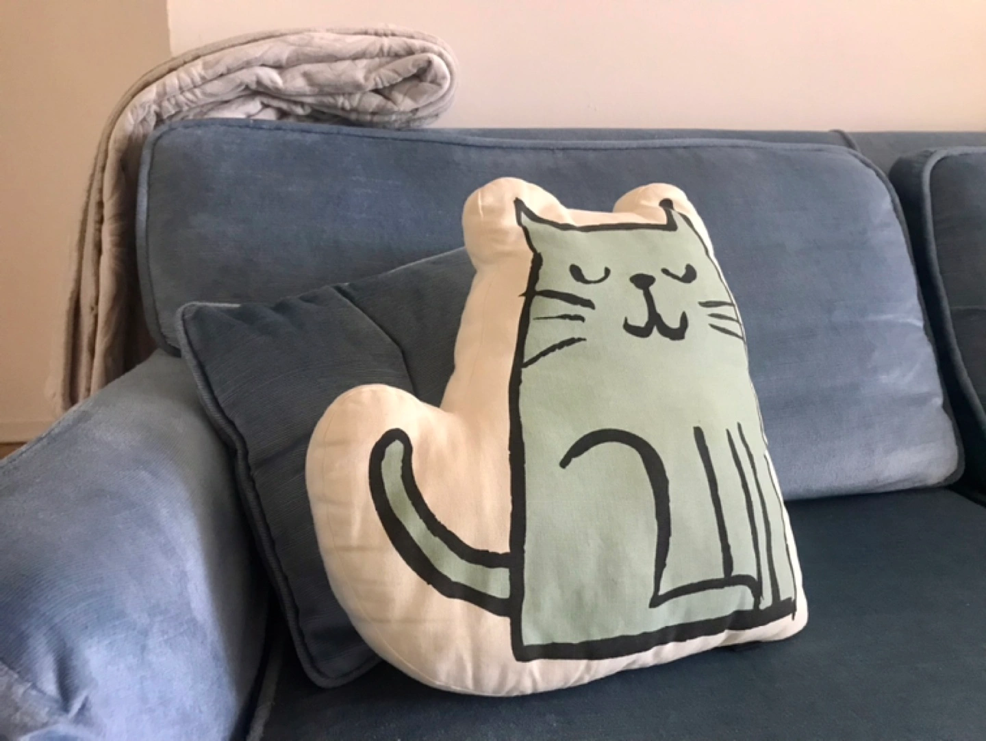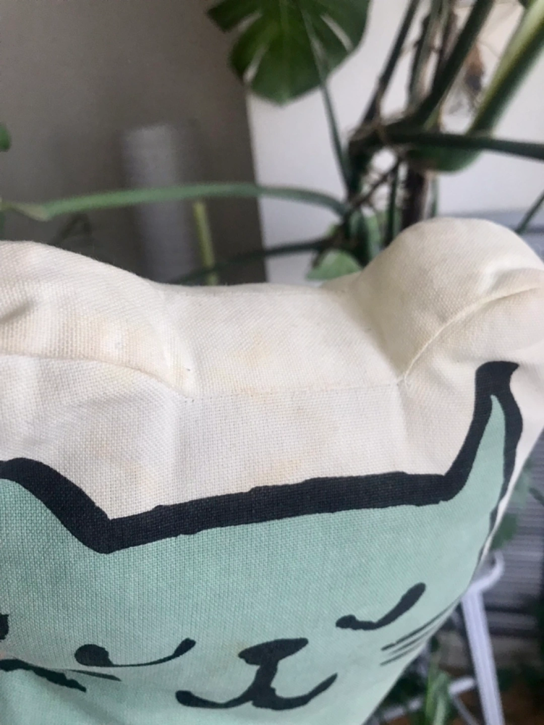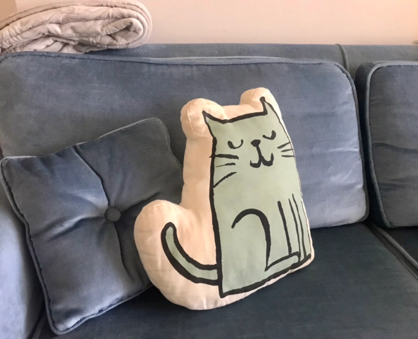 An adorable cushion with a Cat drawing! The Cushion is cut-out/shaped in the cat design. The stuffing is firm and intact, so the cushion is in perfect condition. There are some marks from handling (see close up pics 4, 5), which can be spot-cleaned. It’s not that noticeable once placed on a sofa or chair. 14” W x 13” H Bought at Indigo for $45. This cushion would look great on a living room couch, chair, patio/deck, or on the bed! ————————— ✨FREE: Super cute Cat Earrings!