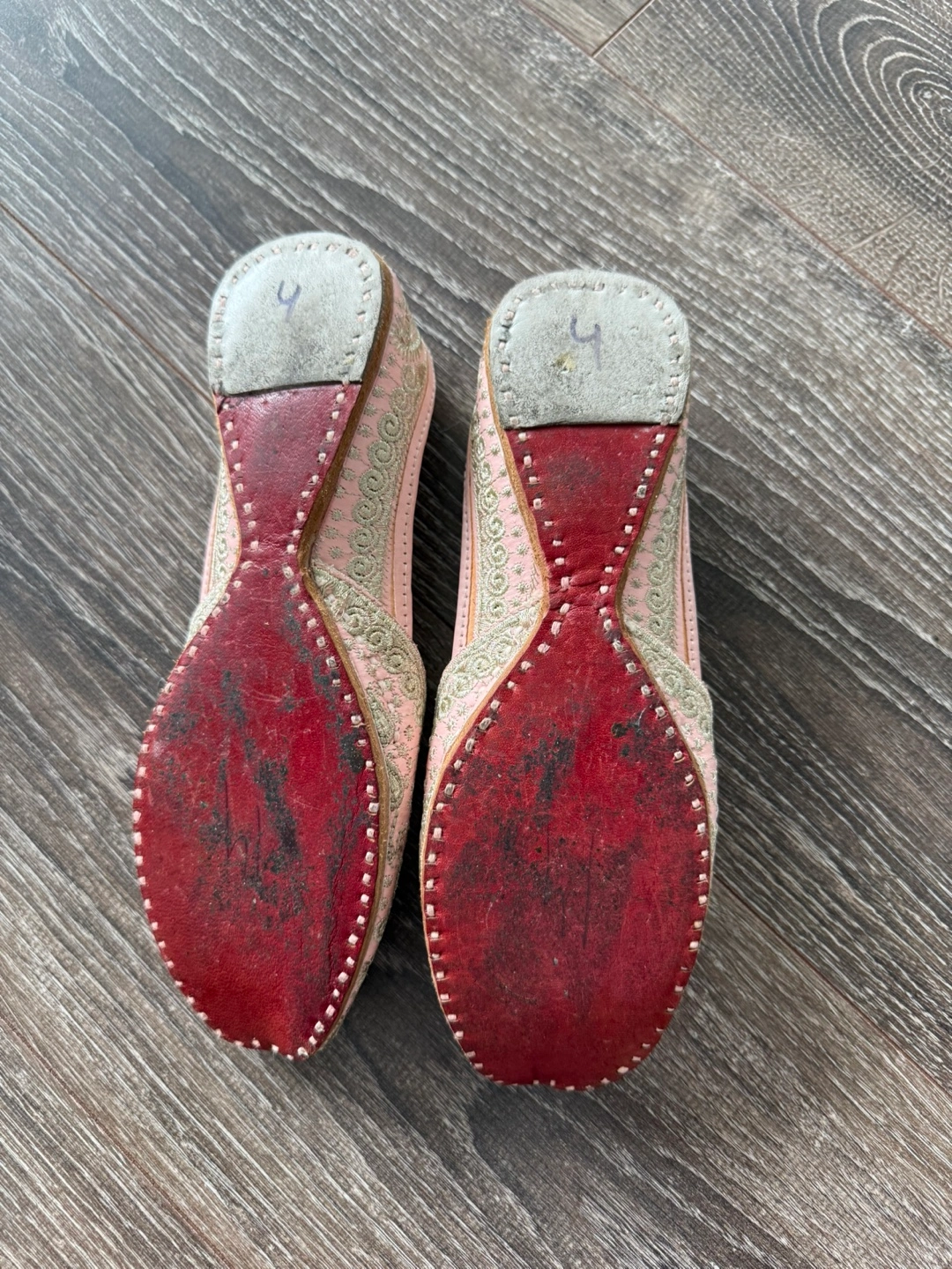 I'm selling a pair of gently used pink shoes. These shoes feature beautiful embroidery. Perfect for adding a touch of elegance to any outfit!