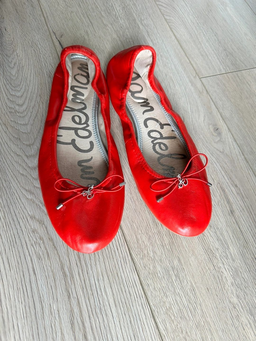These Sam Edelman ballet flats are a vibrant red and made of soft leather. They're a size 9M and feature a cute little bow. Perfect for adding a pop of colour to your outfit!