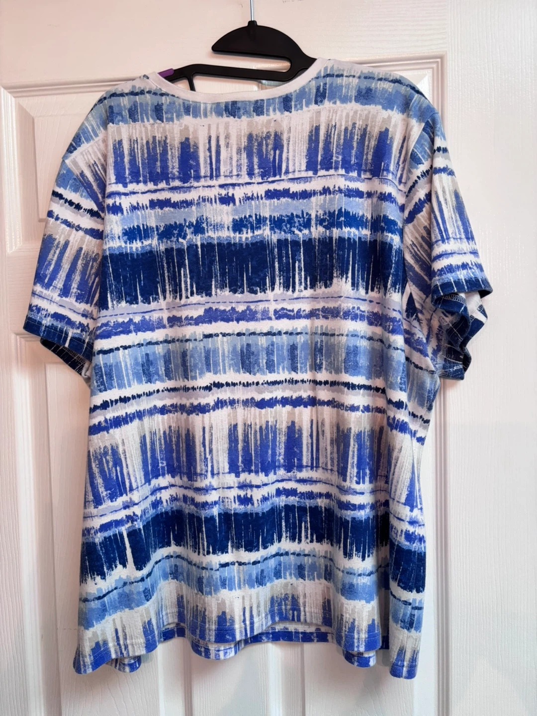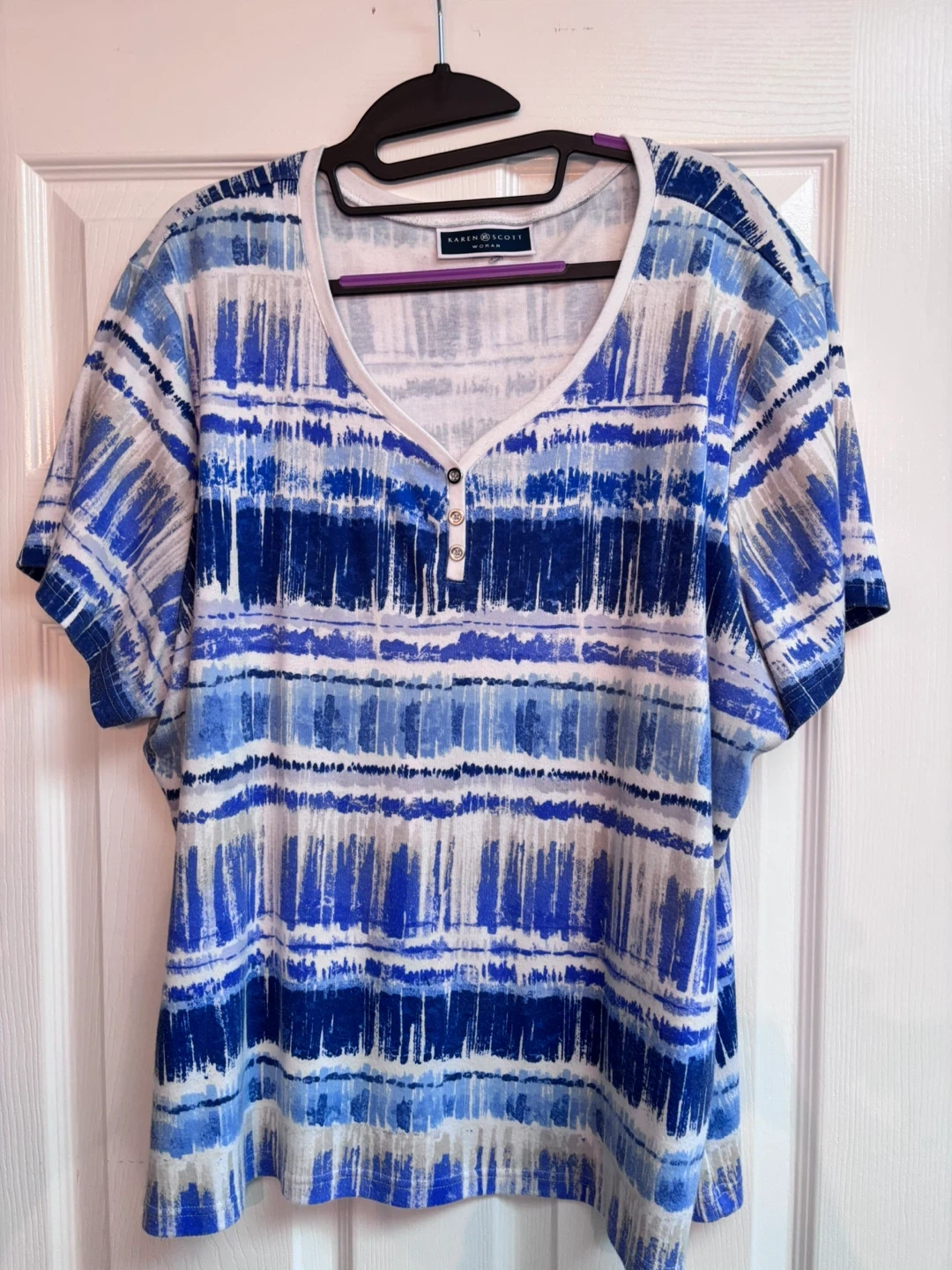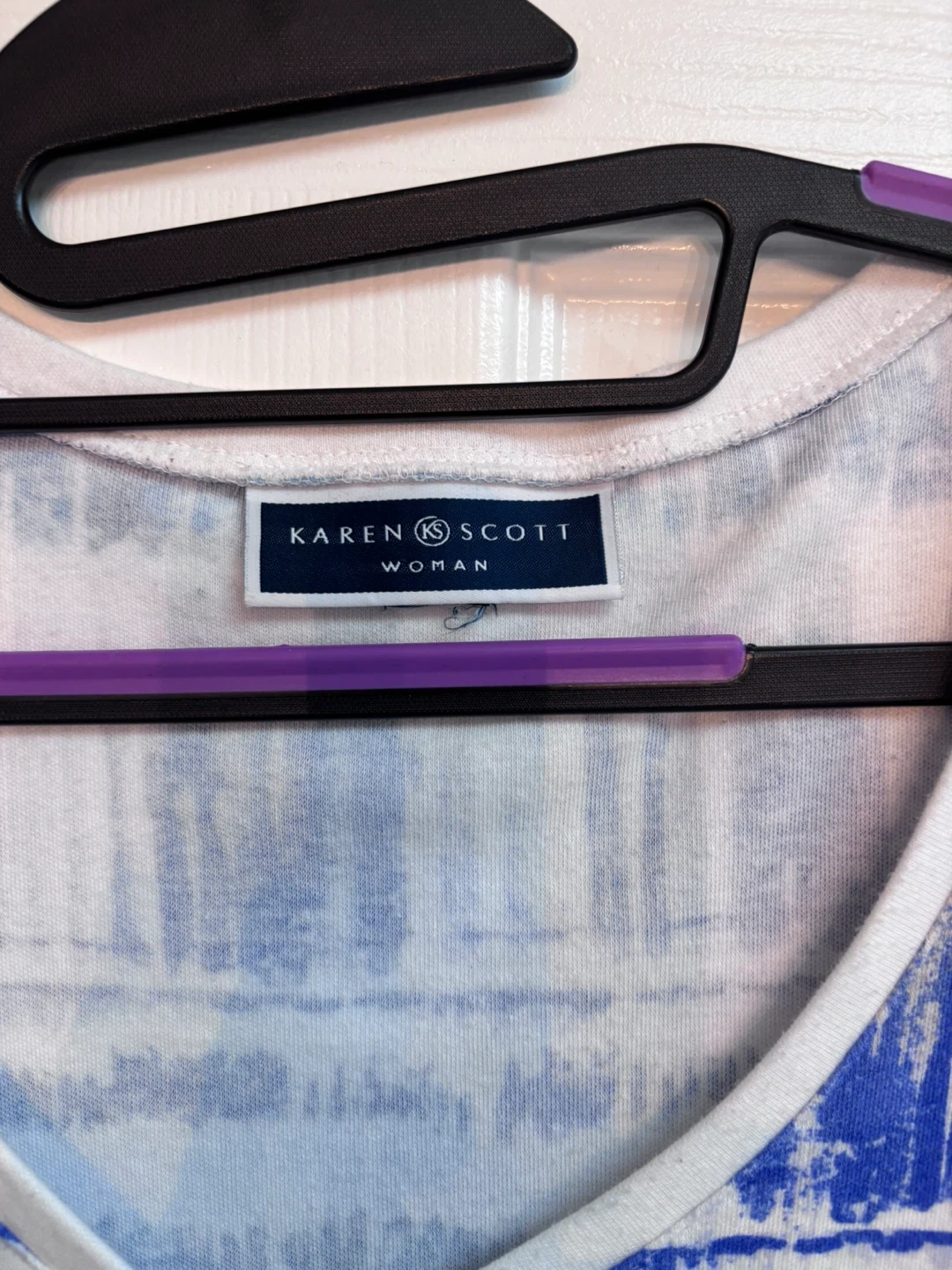 Here's a Karen Scott Woman t-shirt in a lovely blue and white pattern! It's in great condition and ready for a new home. Perfect for casual wear or layering