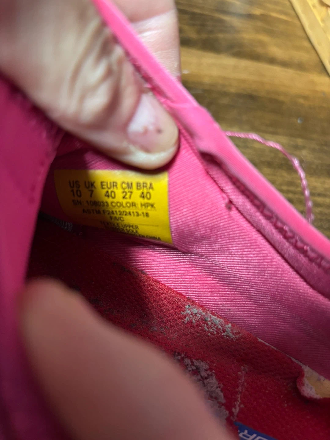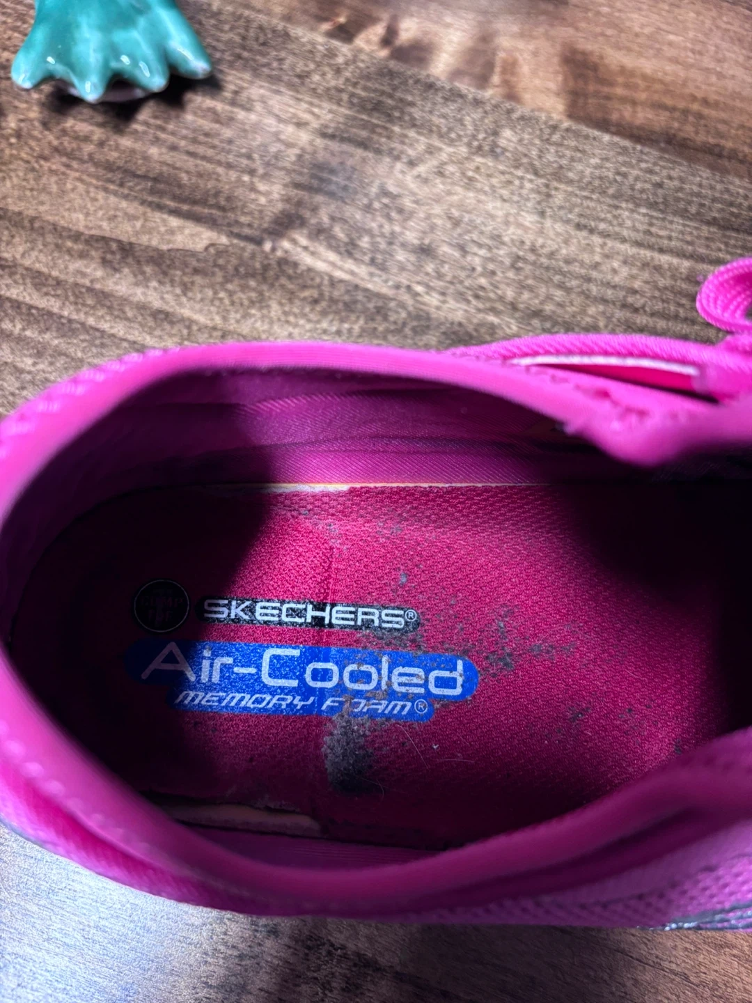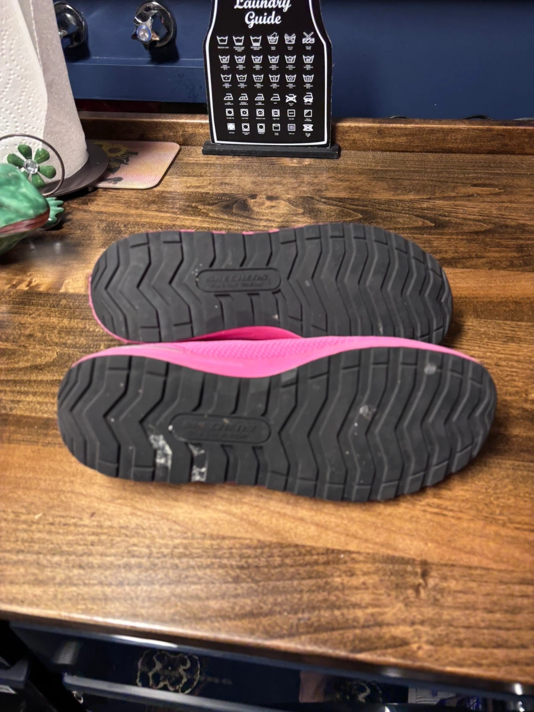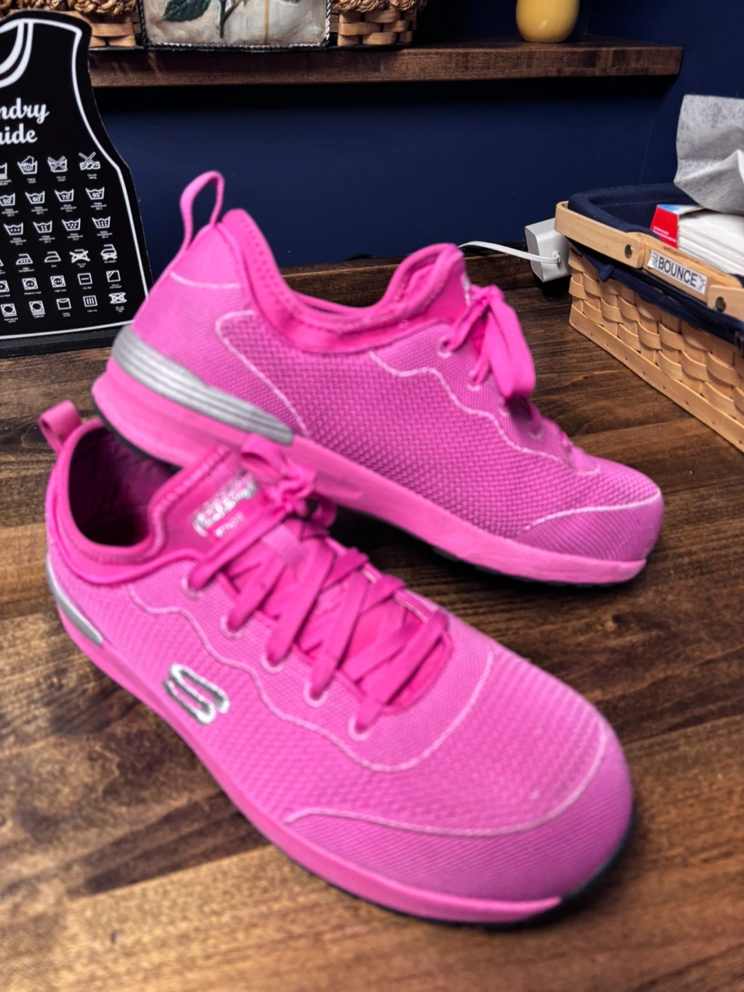 Selling a pair of Skechers Air-Cooled Memory Foam Steel Toed sneakers in bright pink. They are a US size 10. These runners have some wear, but still have lots of life left in them!