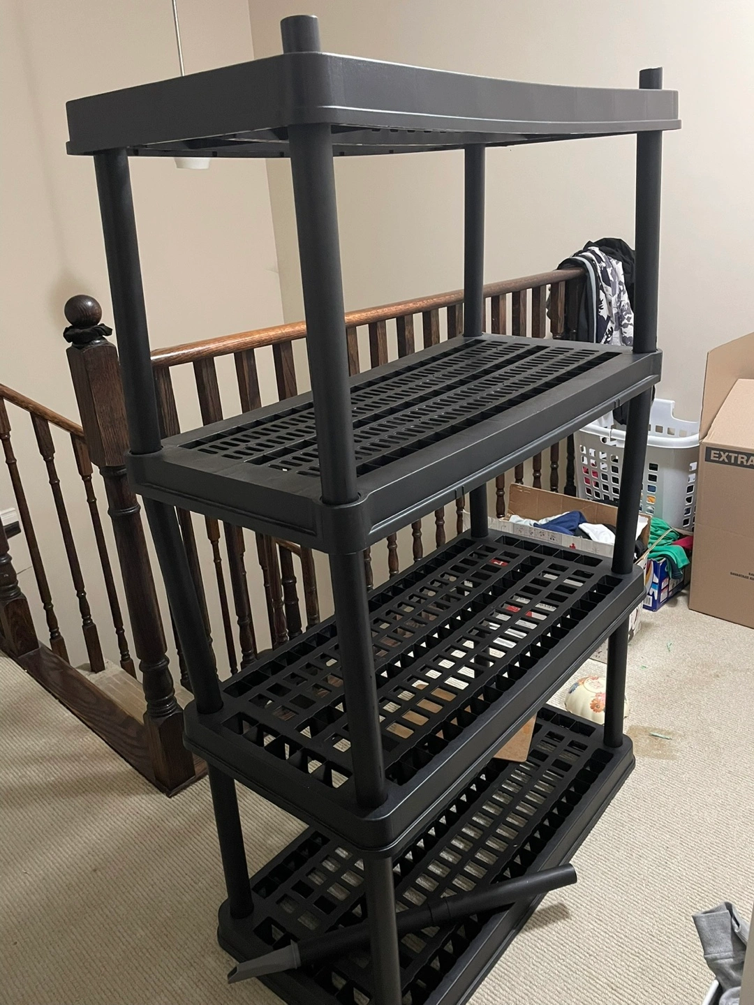 Selling a handy black 4-tier plastic shelving unit. It's perfect for organizing your space, whether it's in the garage, basement, or even a closet. It's in great condition and ready for a new home!