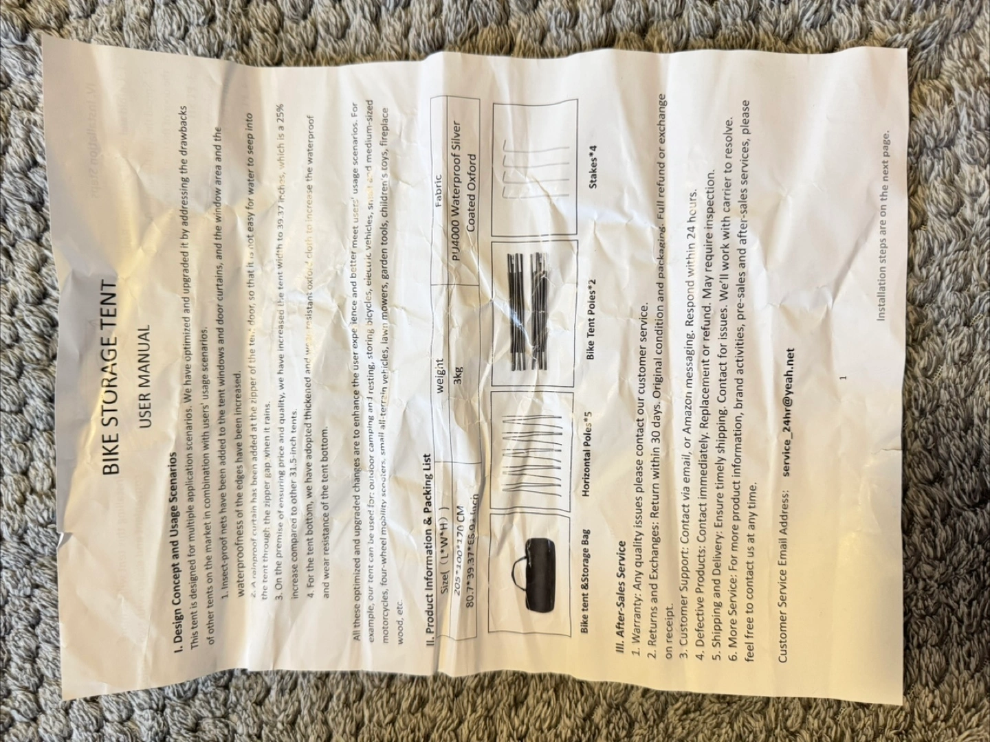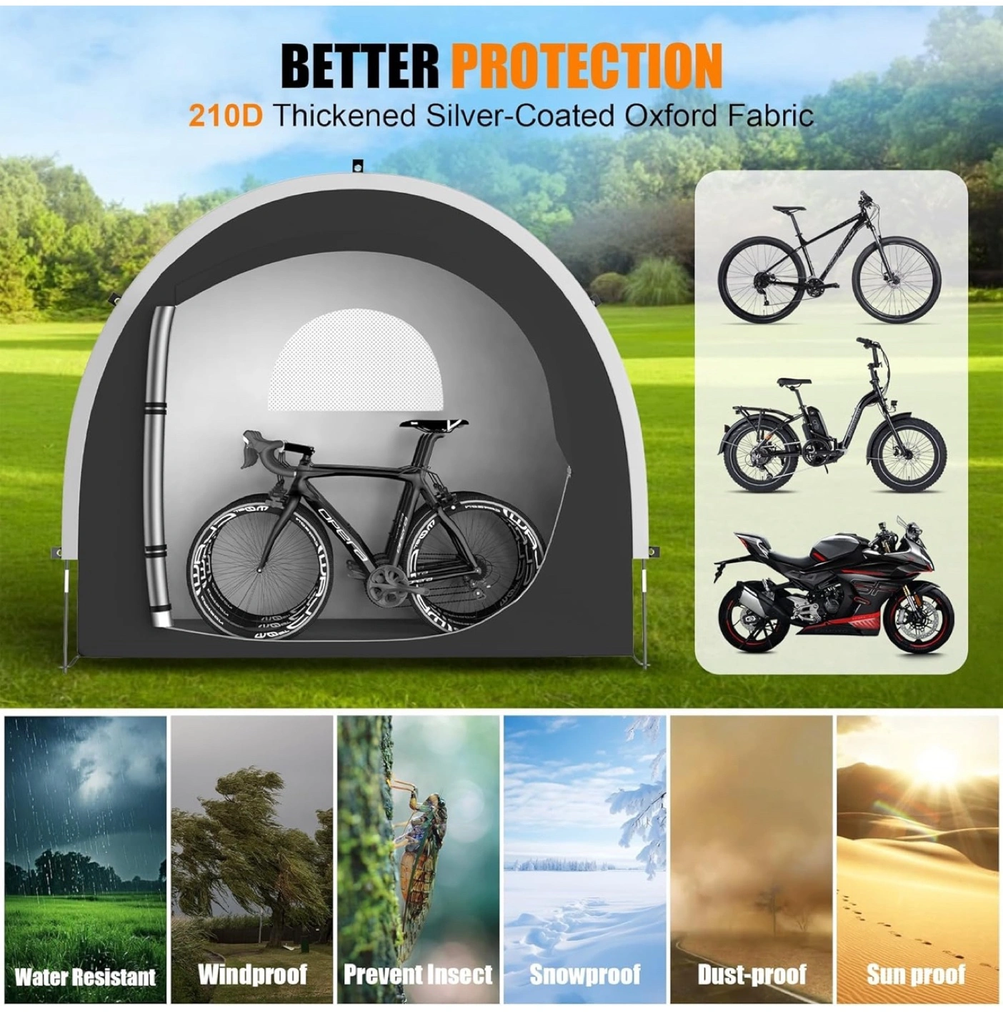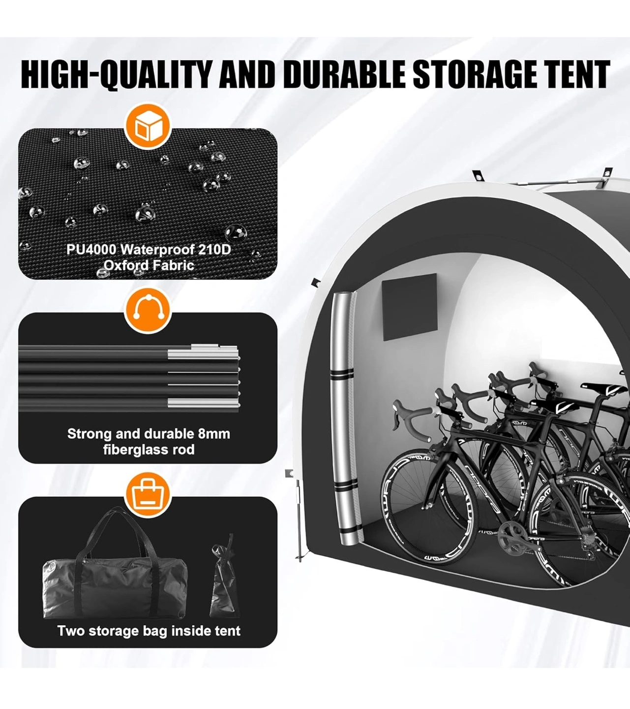 Keep your bikes and other outdoor gear safe and dry with this handy storage tent! It's made with 210D thickened silver-coated Oxford fabric for better protection. - Water-resistant - Windproof - Prevents insects - Snowproof - Dust-proof - Sun proof It also features a strong and durable 8mm fiberglass rod and comes with two storage bags inside the tent cepkquis 39.4" Larger Storage Shed Tent for Bikes,Motorcycle,ebike,eScooter,Lawn Mower Outdoor Protection with Waterproof, Dustproof, Windproof and Sunproof Superior Protection】:The bike tent outdoor storage waterproof is made of 210D Oxford cloth coated with silver and the stitch of the shed are all covered with waterproof tape,which provides excellent waterproof and UV protection.All the stitching parts of the tent are treated with waterproof tape.Our shed adopts 8mm thick fiberglass poles, The bicycle shed is equipped with stakes,so that you can resist rainy,snow and other weather easily . 【Width 39.4 Inch Outdoor Bicycle Sheds】:The outdoor bike storage tent size: 80.7×39.37×66.9 inch, It can accommodate 3 bikes at the same time, Our bike/Ebike/mototcycle/mobility scooter/ATV/UTV/garden tools/toys/lawn mower storage tent is wider than other width 31.5inch tent. So it is undoubtedly a good choice for group outdoor cycling(for outdoor storage), It can also be used for patio storage. 【Multi-scenario Application storage tent】;This storage tent is designed to hold various items likebicycles, Ebikes, motorcycles, mobility scooters, ATVs, UTVs, garden tools, toys, lawn mowers, and similar belongings. It also works as a regular tent for relaxation. Its charm is the multiple protections it offers: rainproof, windproof, sunproof, dustproof and mosquito-proof, ensuring a nice and safe experience. 【Quick Setup & Portable Carry】:The motorcycle storage sheds from the perspective of user needs,so the motorcycle shelter is setup like a conventional camping tent,you only need tent pole is inserted into the tent pole cover in turn.The whole process takes about 8 minutes.The motorcycle shed tent are just as easy to storage,After storage measuring17.8*6*6 inch and weighing just 6.5 pounds.Whether you are traveling by bike or motorcycle,it is a great storage tent. 【Focus on User Experience】:We compared rival products and made several improvements. We added a waterproof zipper edge, used thickened, durable, and waterproof materials for the tent bottom. Insect screens were installed on the tent doors and windows, and the window size was enlarged. These enhancements aimed to boost the tent's waterproofing, ventilation, lifespan, and user experience.