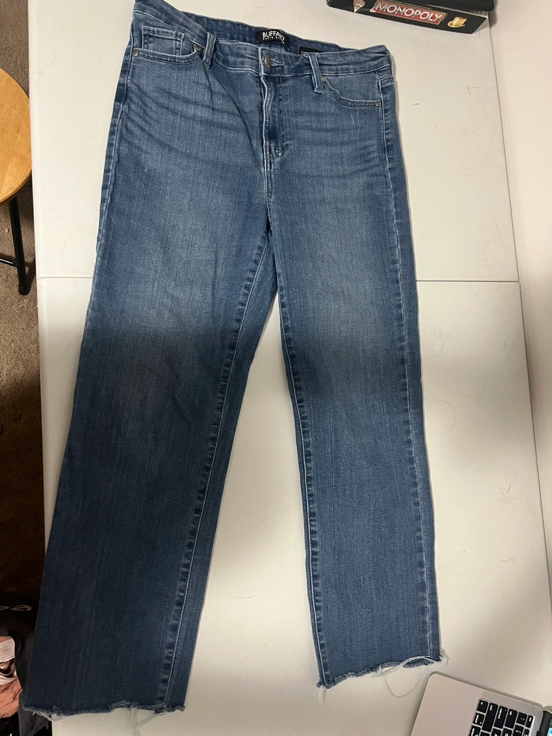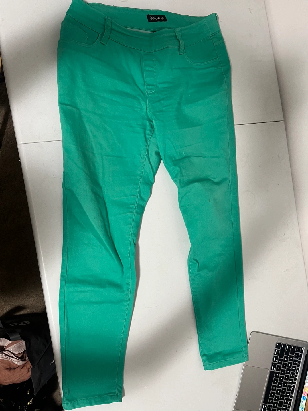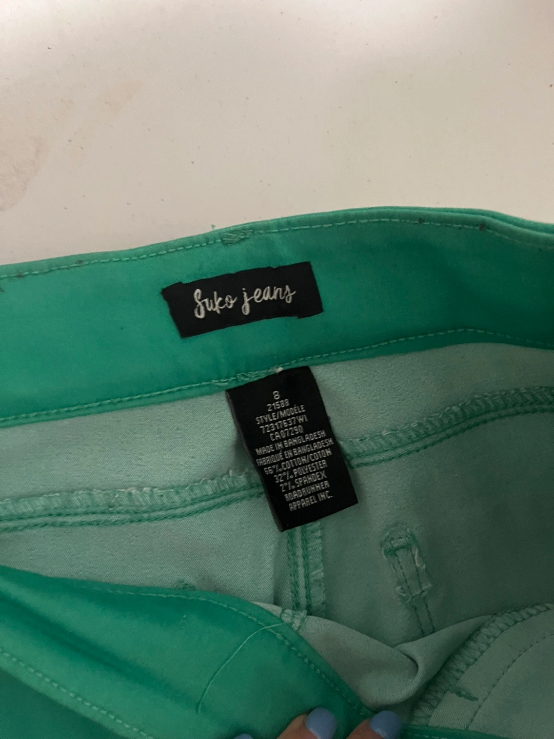 I have two pairs of jeans for sale: - Suko Jeans, size 8, in a vibrant green colour. Made of 66% cotton, 32% polyester, and 2% spandex. - Buffalo David Bitton Alyssa High Rise Straight Leg Stretch Denim Jeans, size 8