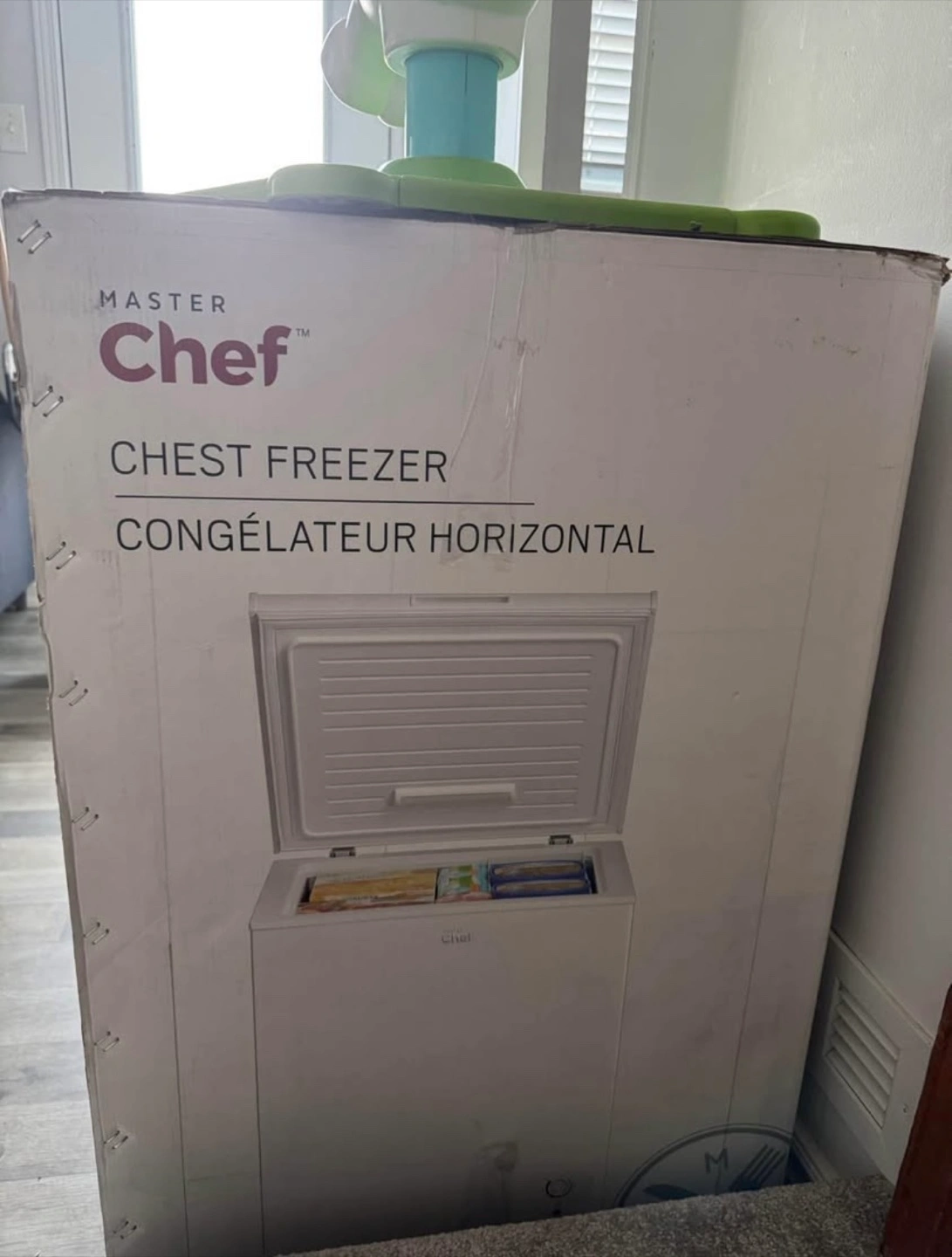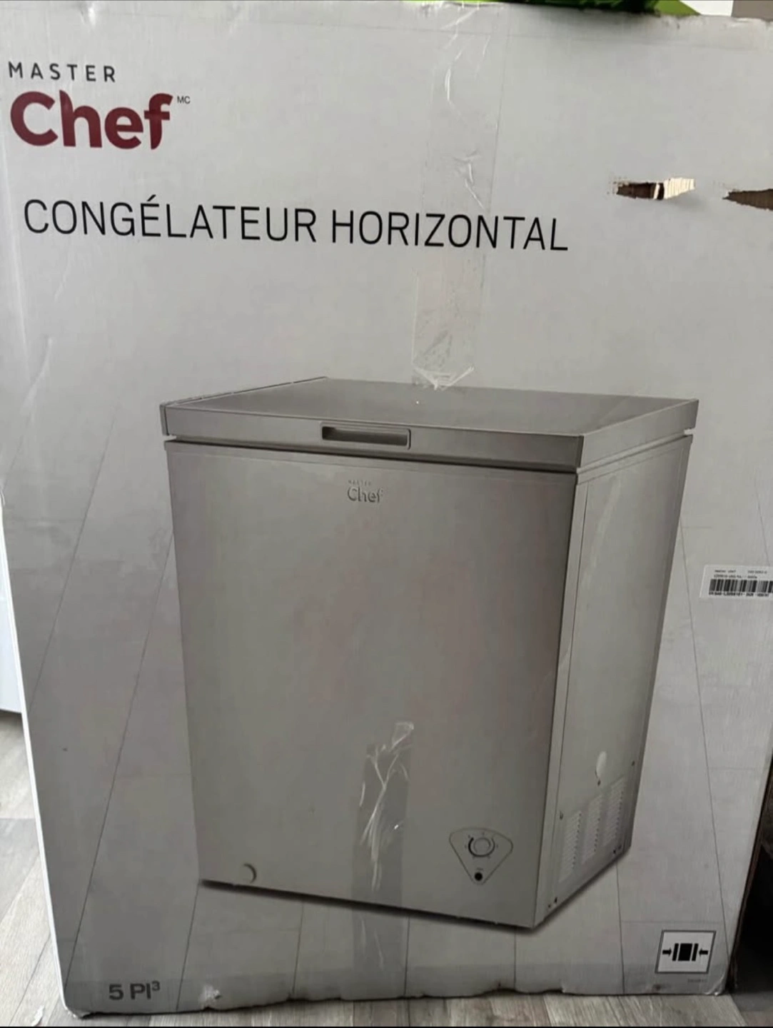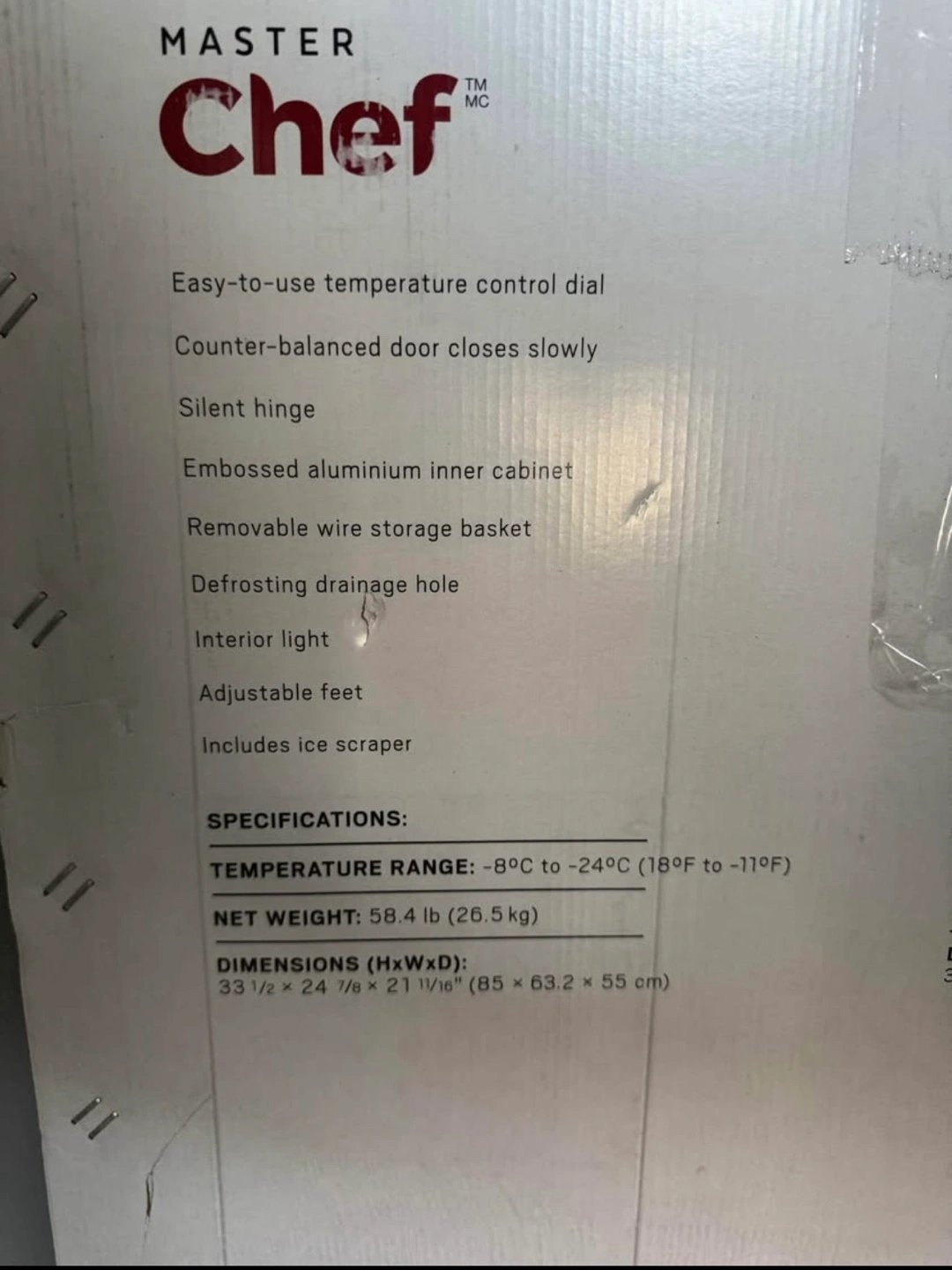 Selling a Master Chef chest freezer in excellent condition! It features an easy-to-use temperature control dial and a counter-balanced door that closes slowly. - Silent hinge - Embossed aluminum inner cabinet - Removable wire storage basket - Defrosting drainage hole - Interior light - Adjustable feet - Includes an ice scraper Specifications: Temperature Range: -8°C to -24°C (18°F to -11°F) Net Weight: 58.4 lb (26.5 kg) Dimensions (HxWxD): 33 1/2 x 24 7/8 x 21 11/16" (85 x 63.2 x 55 cm)