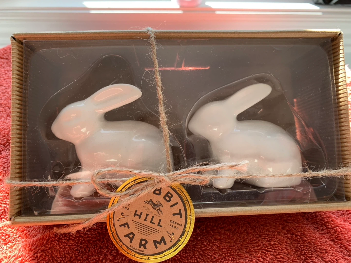 Here are two adorable ceramic bunny salt & pepper shakers from Rabbit Hill Farm! They come in their original box.