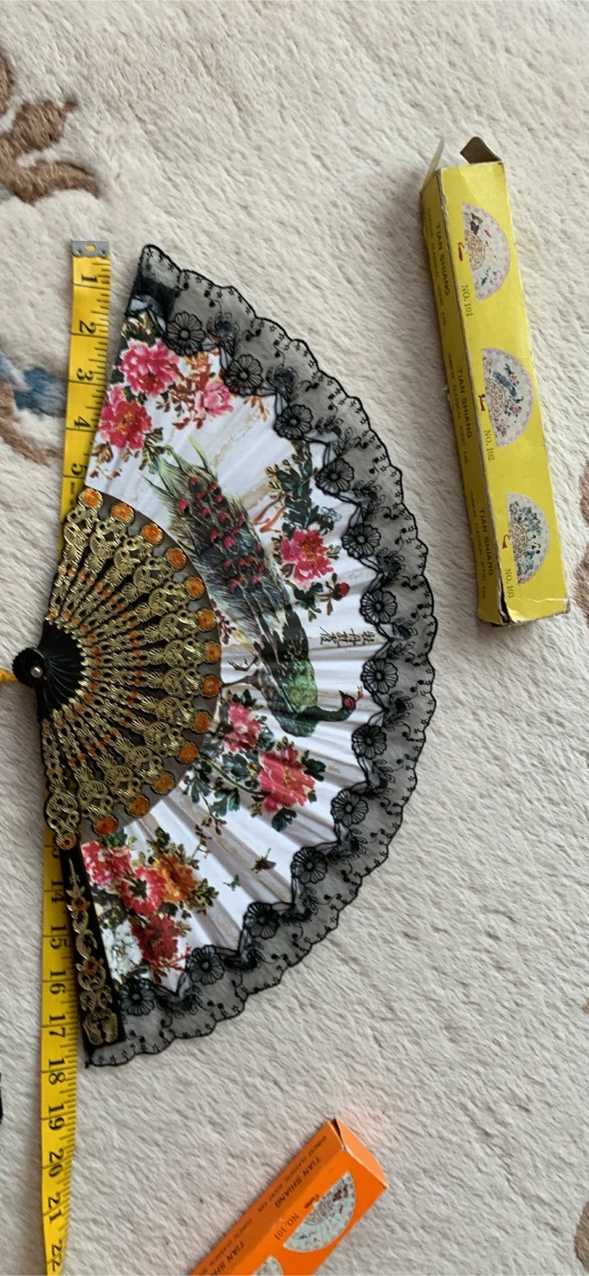 Chinese Folding hand fan featuring a lovely peacock and floral design! The fan has delicate black lace trim. It measures approximately 9”x 18”.
