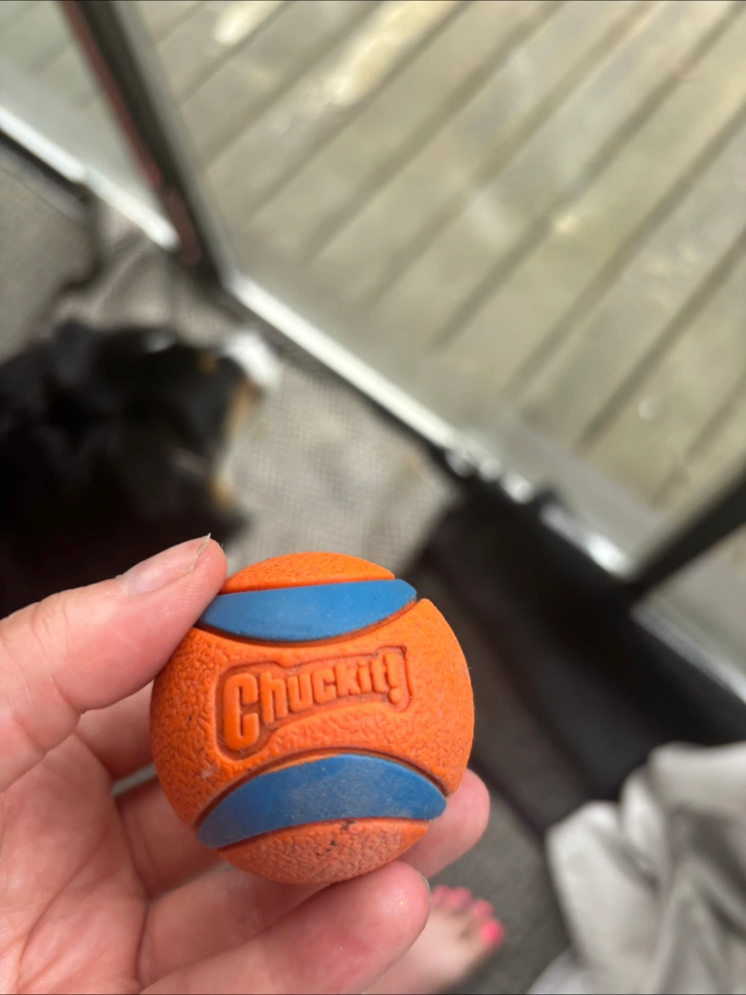Selling a Chuckit! dog ball. It's orange with blue accents. Perfect for fetch! This ball is small and suited to a smaller dog or puppy