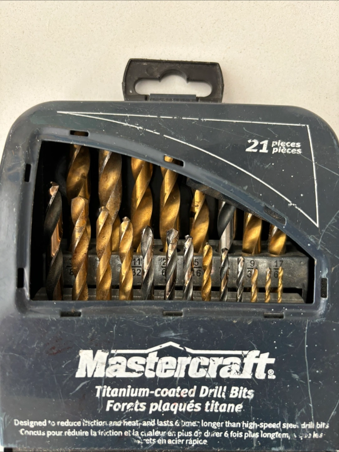 Selling a Mastercraft titanium-coated drill bit set. It includes 21 pieces and is designed to reduce friction and heat, lasting longer than high-speed steel drill bits.