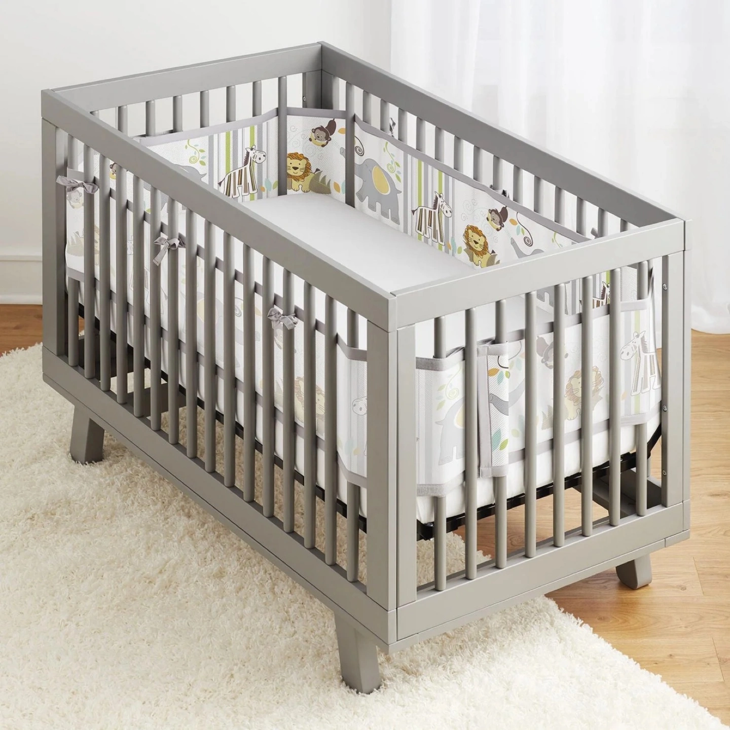 Keep your little one safe and comfy with this BreathableBaby crib liner! It's designed to fit full-size cribs and covers either 3 or 4 sides. The liner is grey and features a cute animal print with elephants, zebras, and lions. Perfect for creating a cozy and breathable sleep environment for your baby Classic 3mm Mesh – A.C.T. Air Channel Technology allows unrestricted airflow; 85% light-blocking. 100% polyester, machine washable. Fits Full-Size Cribs – For 52" x 28" (132 x 71 cm) mattress. Long panel (11" x 111") and short panel (11" x 82") cover 3 or 4 sides. Not for mini cribs or solid-end cribs. Safety Tested & Trusted – The original breathable liner, millions sold since 2002. ASTM F1917 compliant. No flame retardants or formaldehyde. Protects Baby – Keeps little arms and legs safely inside the crib without blocking airflow. Safer alternative to padded bumpers (banned in the US in 2022). Easy to Install – Hook-and-loop fasteners for a secure fit; trim tucks below mattress edge. 📍 Pickup in Scarborough 🚗 Local delivery available for a small fee.