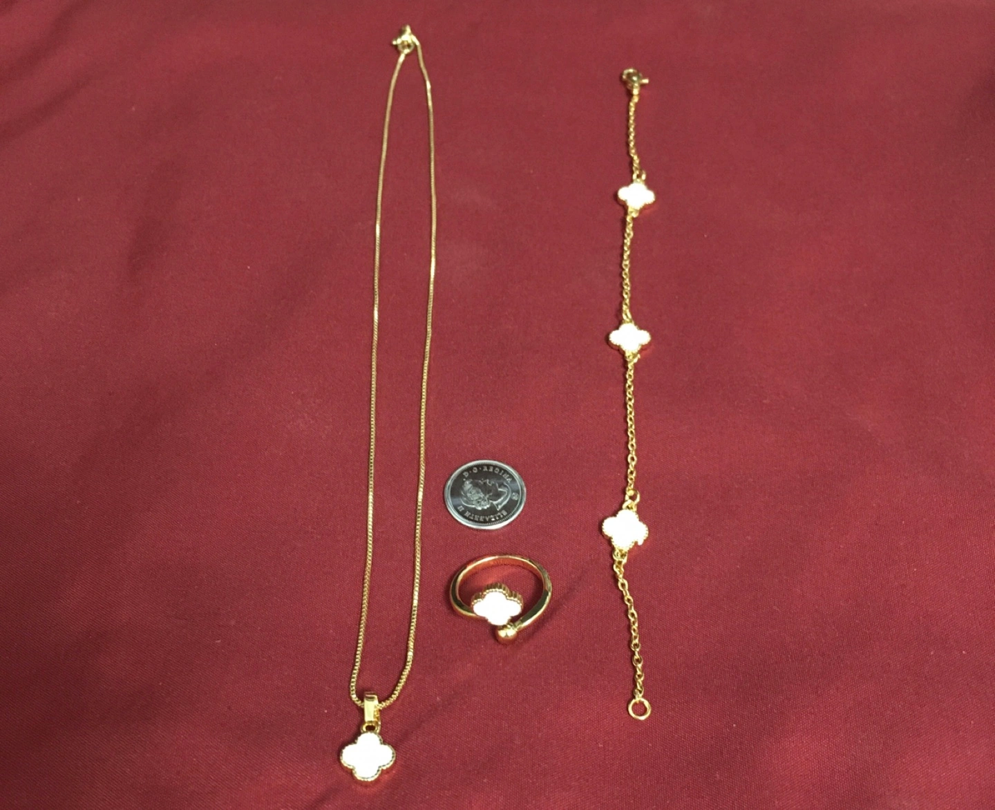 Selling a cute clover jewelry set! Includes a necklace (the chain is about 9 inches long), a ring, and a bracelet. Comes with the original boxes Pick up at Southgate Mall after 6pm on weekdays, weekends between 5-6pm Cash only Price reflects authenticity