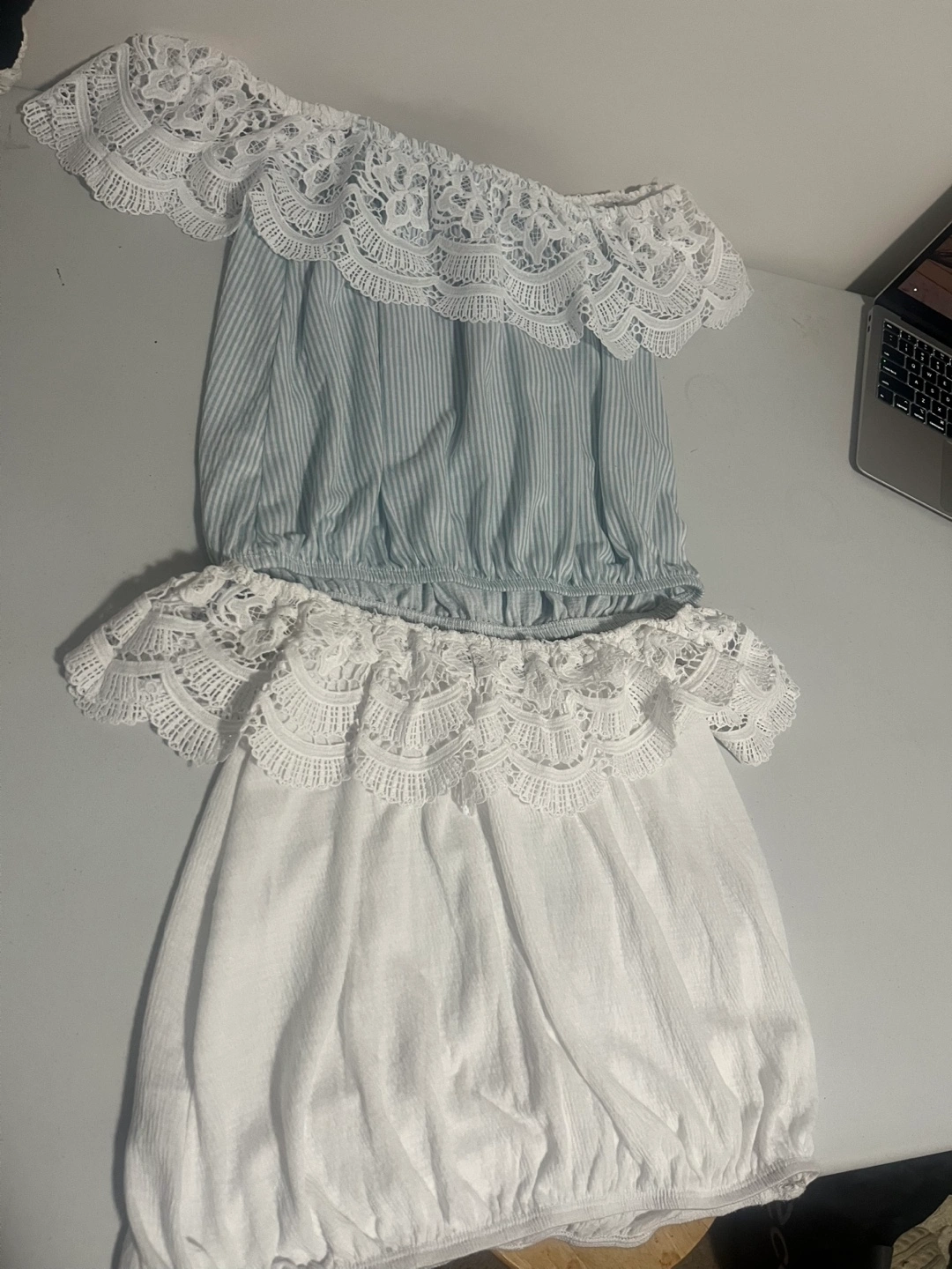 Used once size small Cute off-shoulder top with lace detailing. It features a striped blue and white section on top and a solid white section on the bottom. Perfect for a casual summer look!