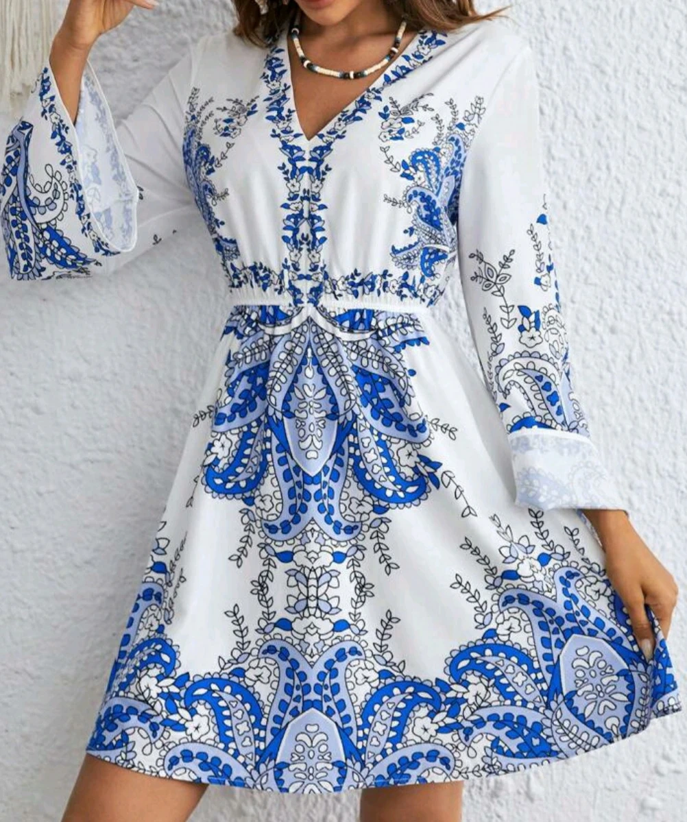 This dress features a lovely white and blue pattern. It has long sleeves and a V-neck cut. brand new pickup Markham Scarborough North York Etobicoke area