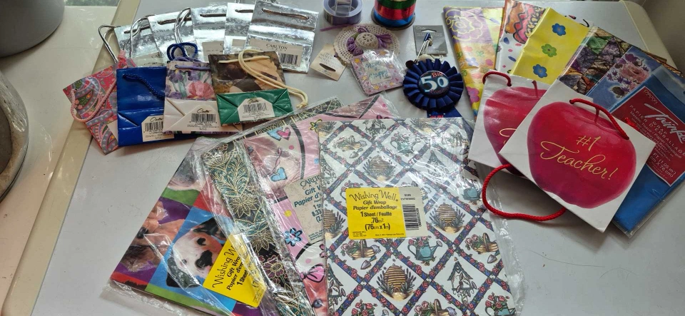 A collection of gift bags and wrapping paper, including brands like Carlton and Wishing Well. There are various designs and sizes available, perfect for any occasion. Some wrapping paper is still sealed in its original packaging. Great for teachers or anyone who loves to wrap gifts!
