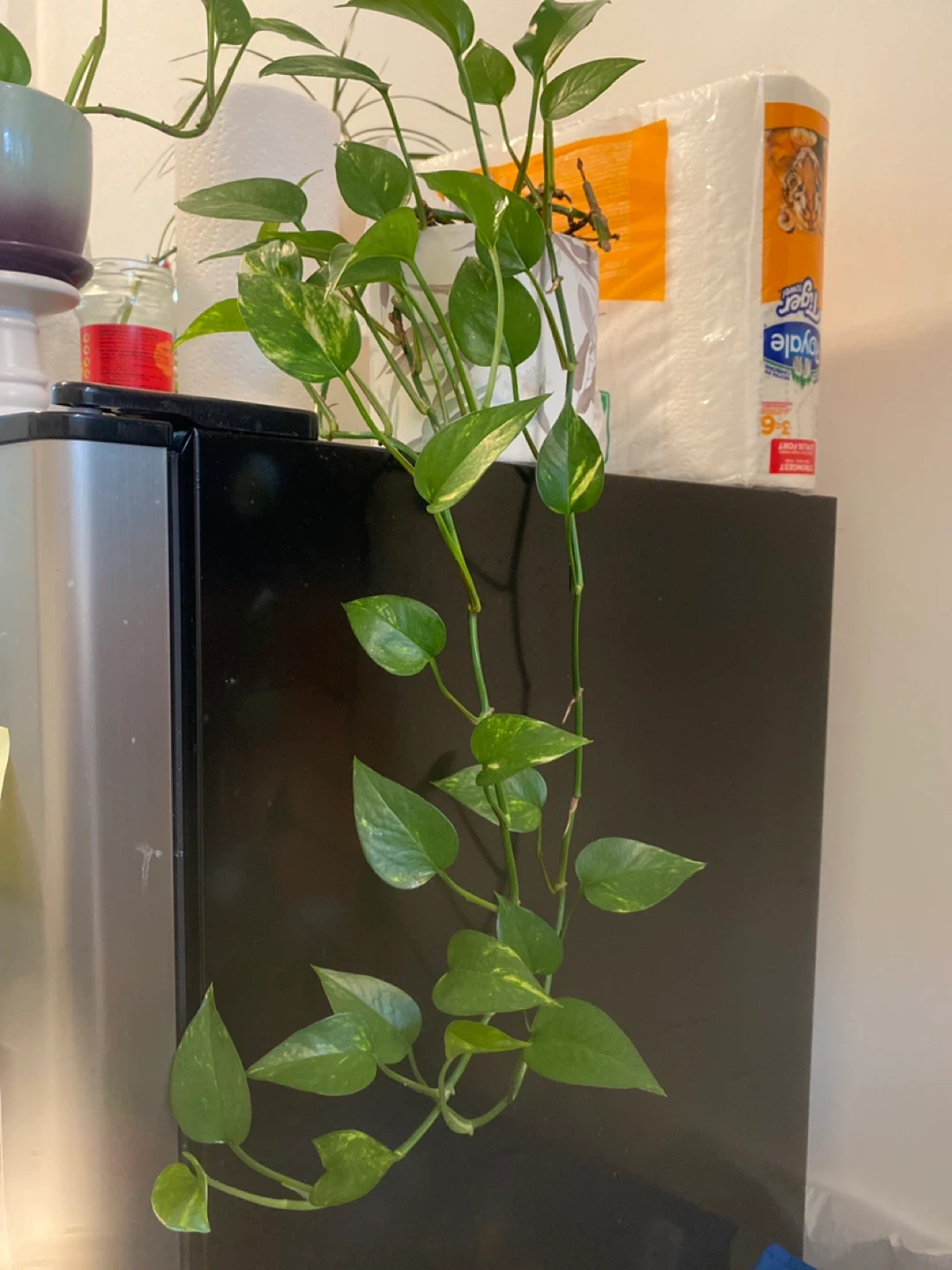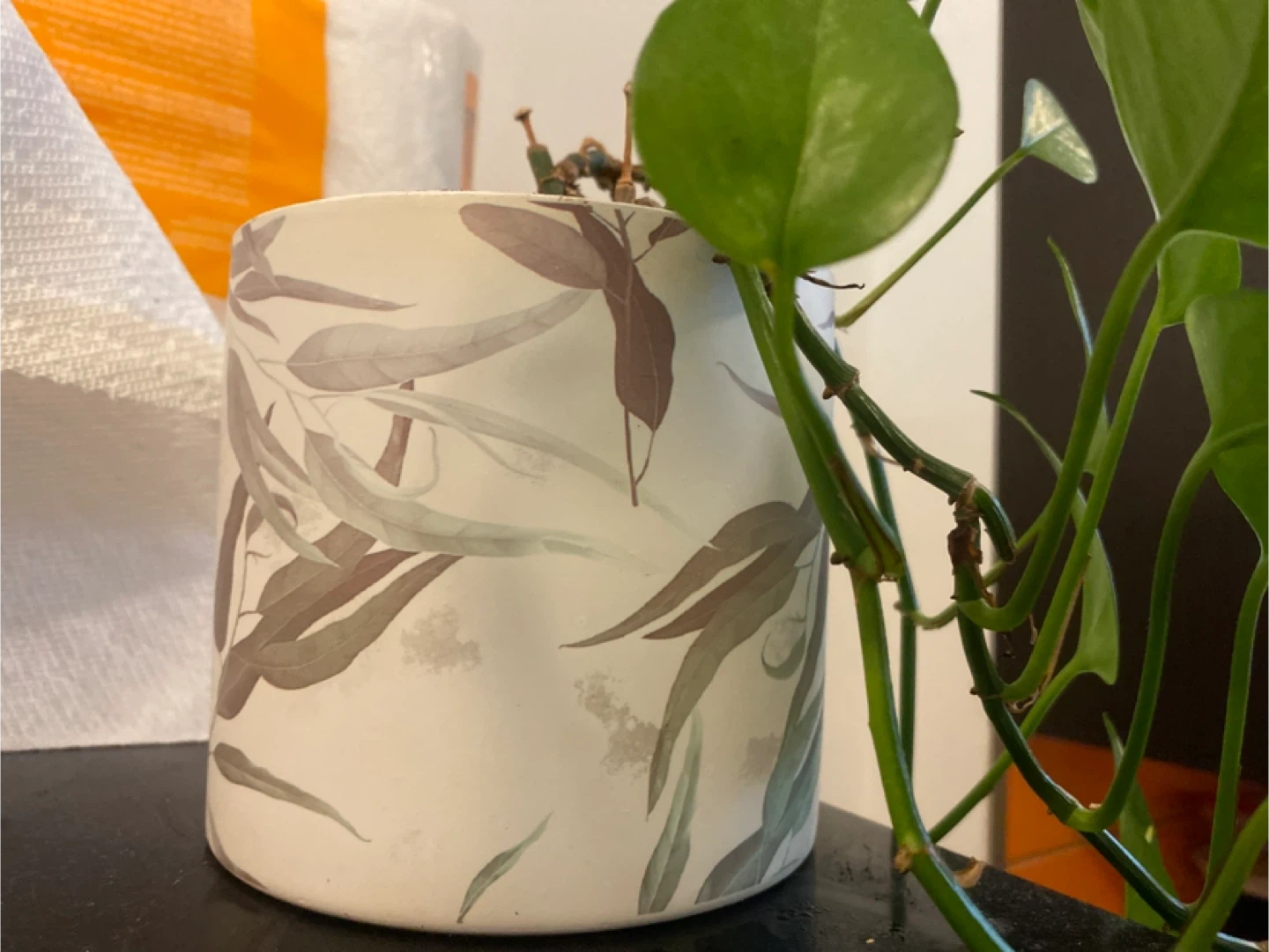 I have a lovely golden pothos plant in a decorative pot. It's a great way to add some greenery to your space and is super easy to care for! The pot has a nice leaf design on it