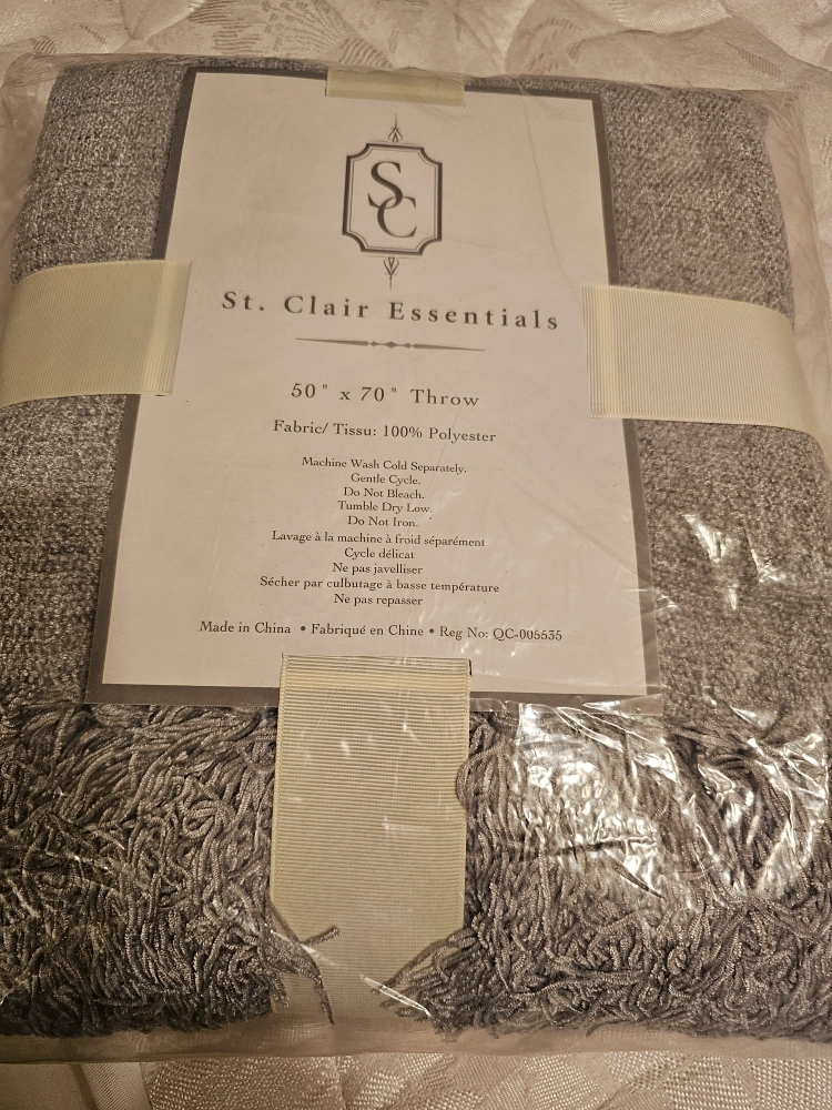 Selling a brand new St. Clair Essentials throw, still in its original packaging! It's a 50" x 70" throw made of 100% polyester. Easy to care for: just machine wash cold separately on a gentle cycle, tumble dry low, and don't iron or bleach
