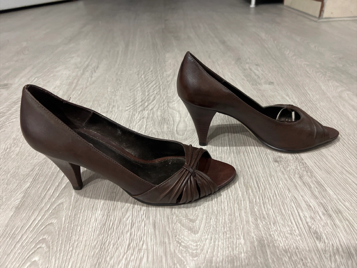 These are a pair of brown heels from ALDO in a size 8. They have a peep toe and a nice design on the front. Perfect for dressing up or down!