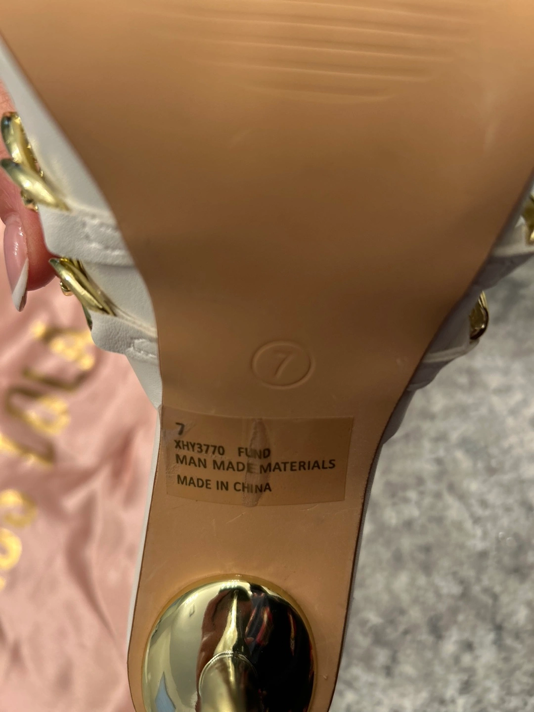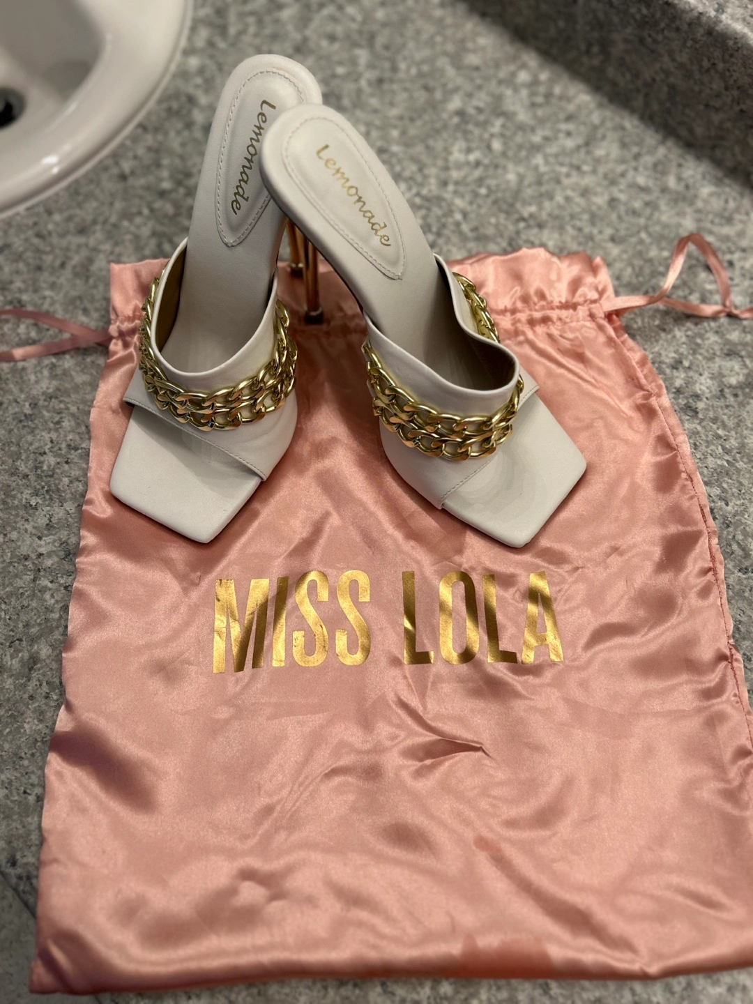 These stylish Lemonade Miss Lola heels are a size 7. They feature a chic design with gold chain detailing. The heels come with their original dust bag. Perfect for adding a touch of elegance to any outfit!