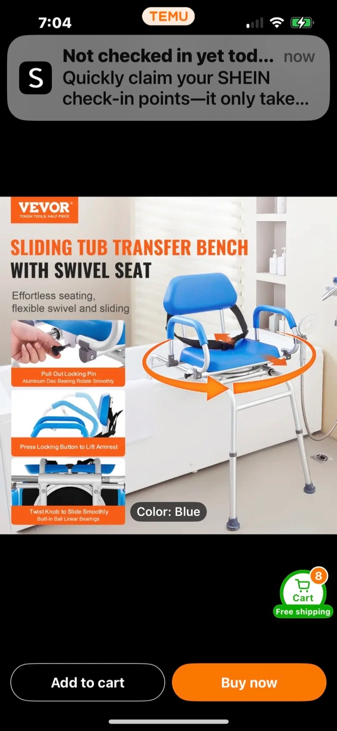 Selling a Vevor sliding tub transfer bench with a swivel seat! It's in blue and looks like it's in great shape. It offers effortless seating with a flexible swivel and sliding motion. It also features a pull-out locking pin and a press locking button to lift the armrest. The twist knob helps to slide smoothly with built-in ball linear bearings