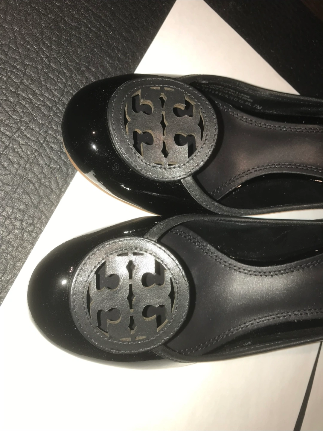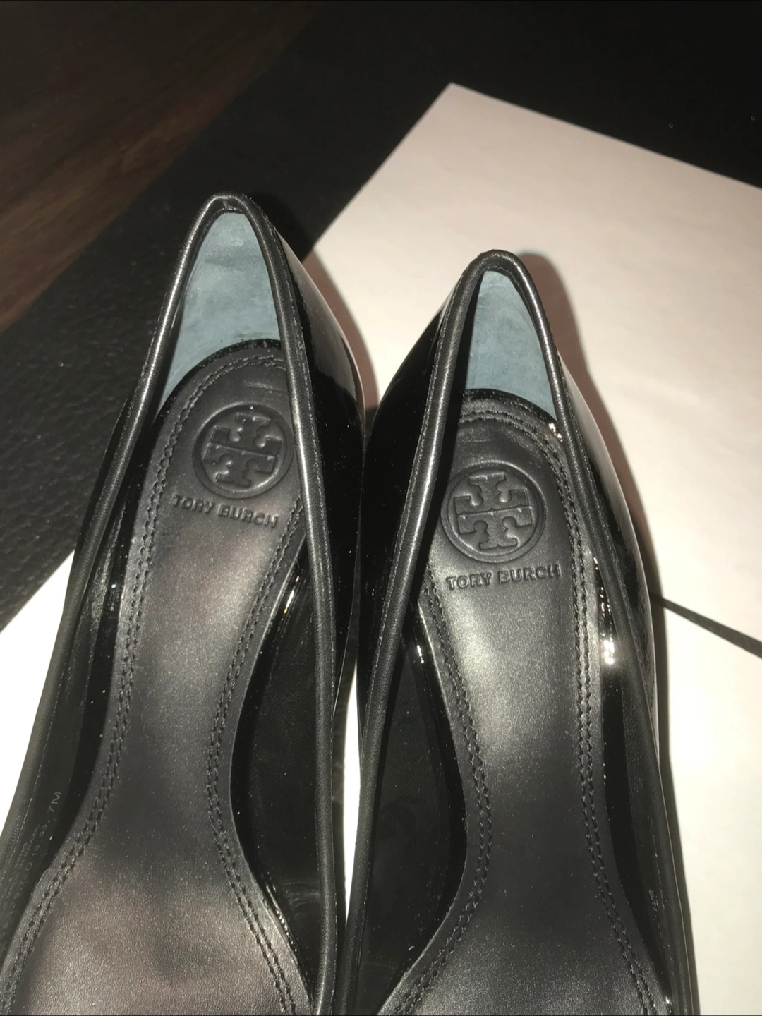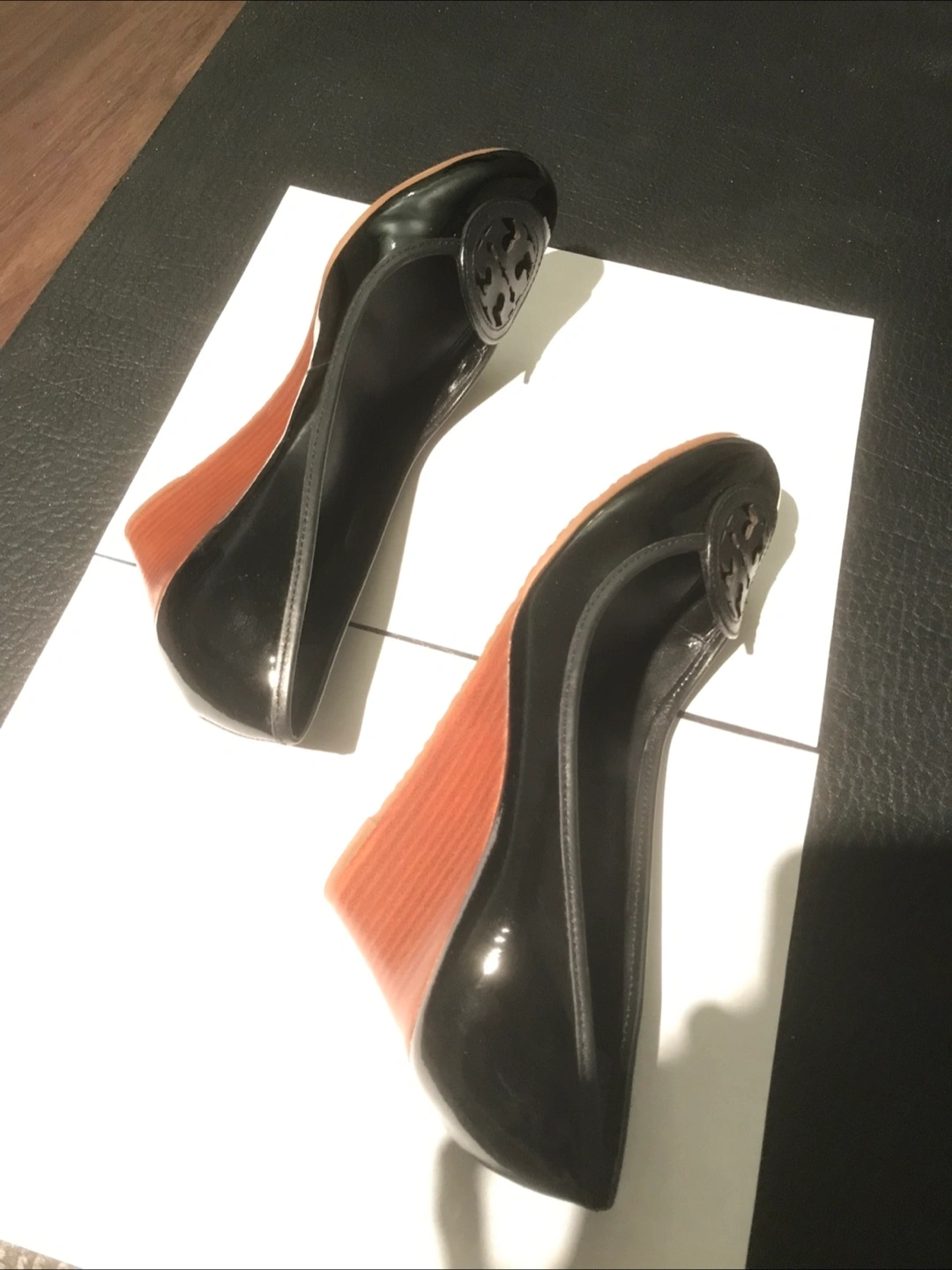 These are a pair of Tory Burch wedge heel shoes in black patent leather. They feature the Tory Burch logo on the front. They are in good condition and ready for a new home!