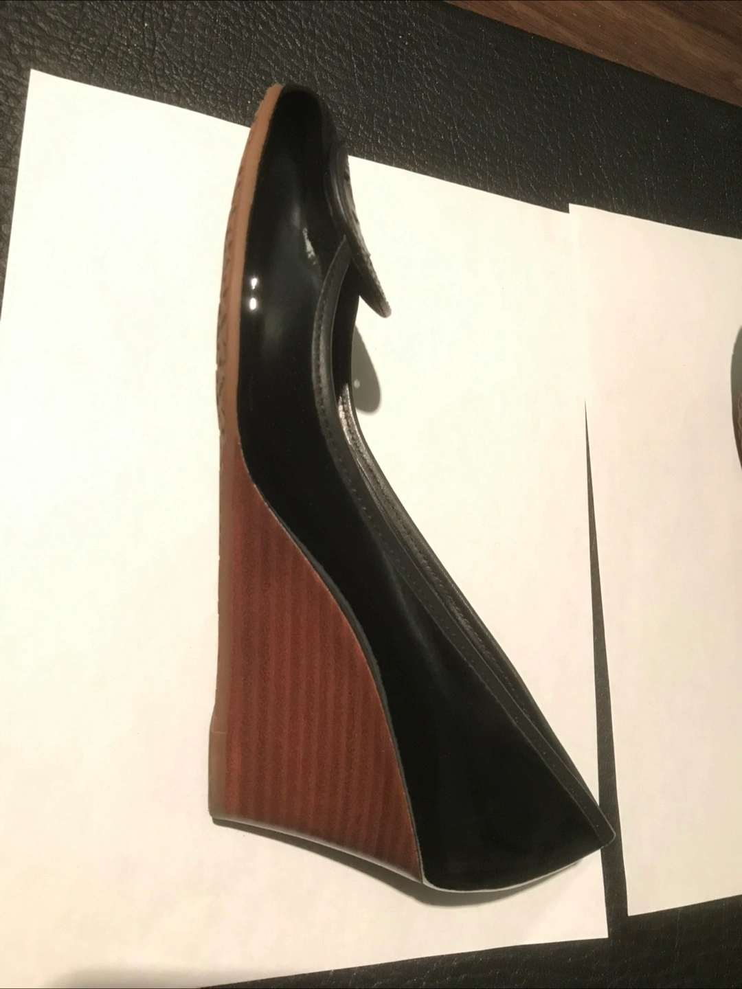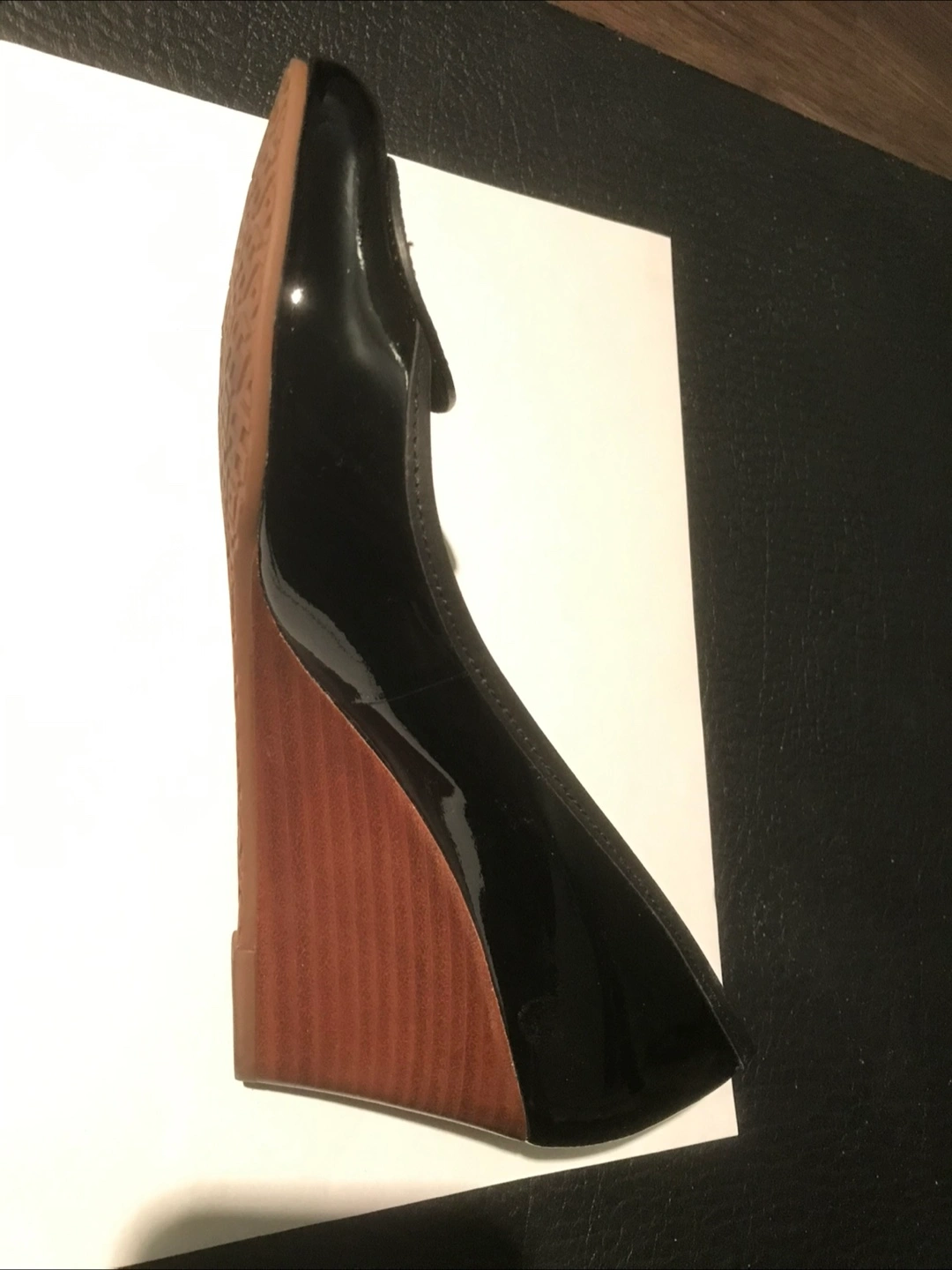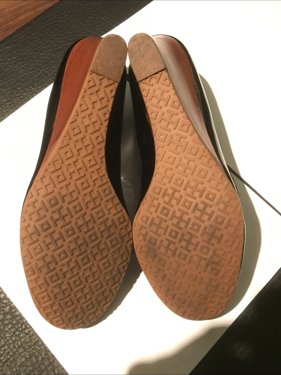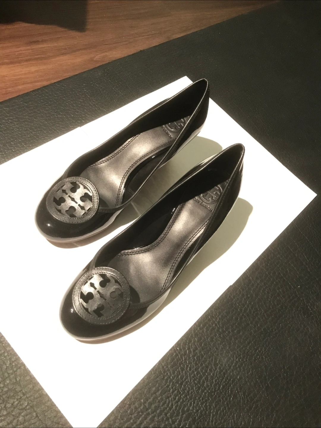 These are a pair of Tory Burch wedge heel shoes in black patent leather. They feature the Tory Burch logo on the front. They are in good condition and ready for a new home!