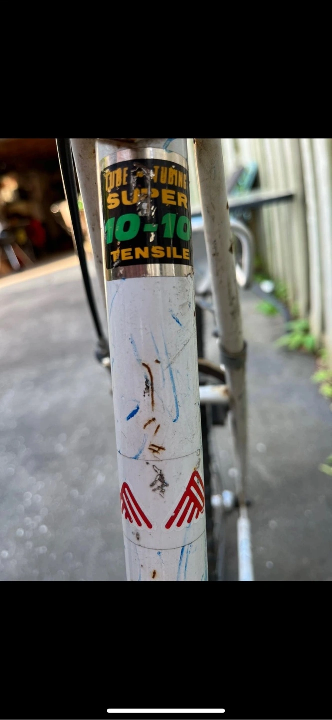 A vintage mountain bike. It has front and rear brakes, a front reflector and rear rack. The frame is white and blue. Enjoy a relaxing ride through the park on this bike.