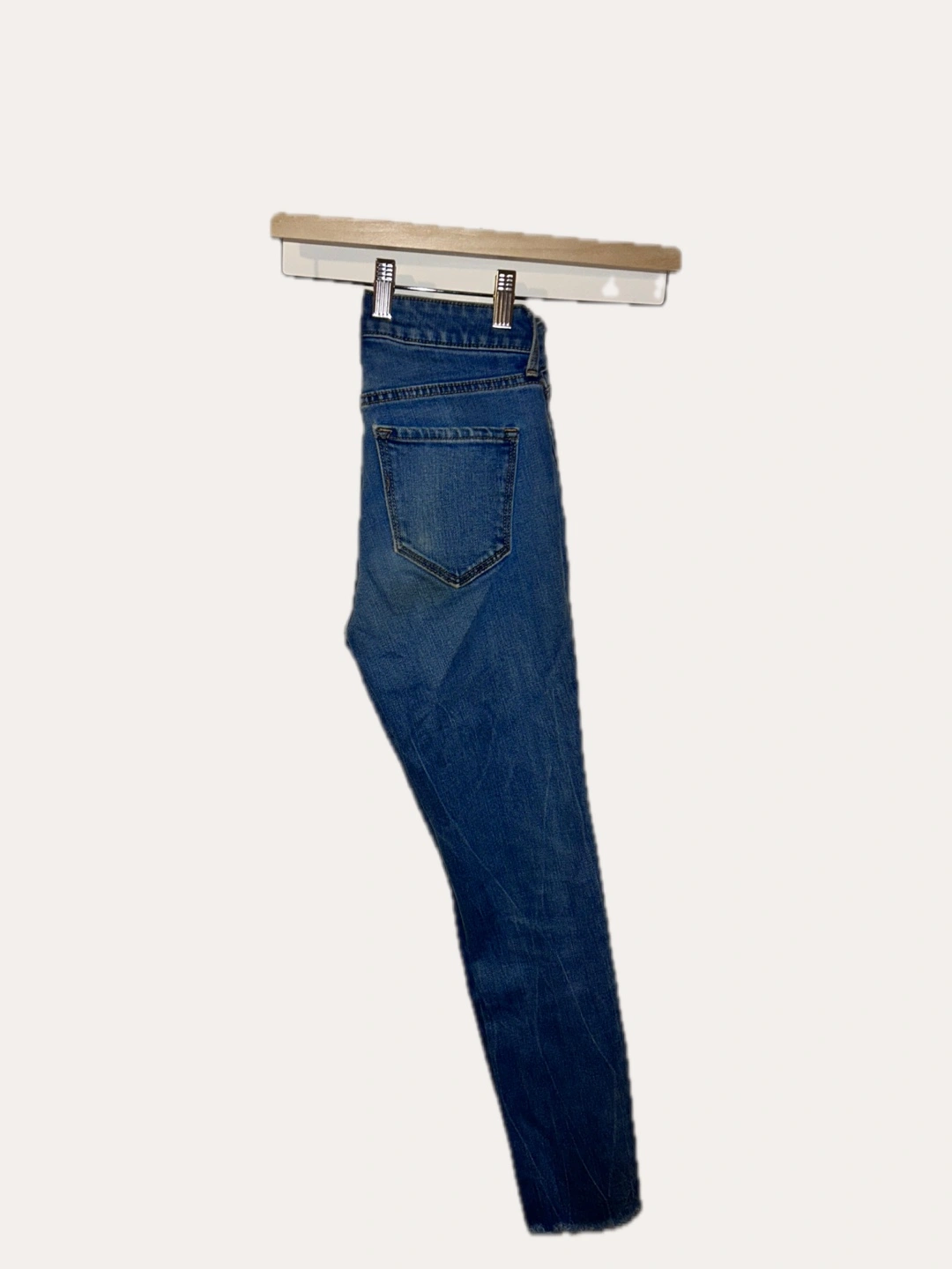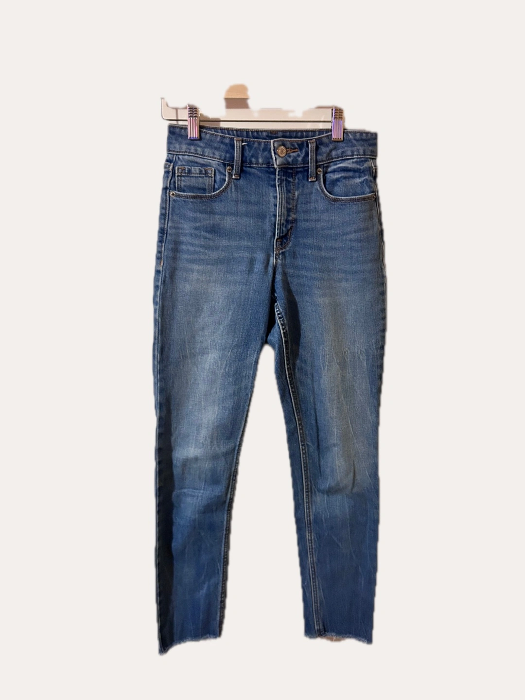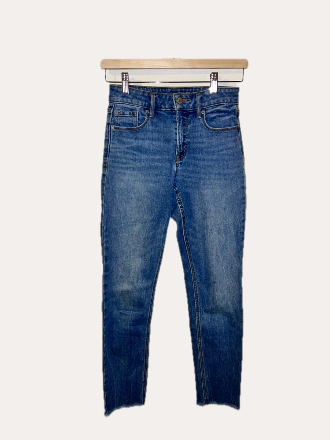 These are a pair of Old Navy high-waisted straight leg jeans in size 0. The classic denim wash, and frayed edges of these jeans make them super versatile for any outfit! condition: loved cash preferred meet- Shoppers Drug Mart (Bayview & Elgin Mills)