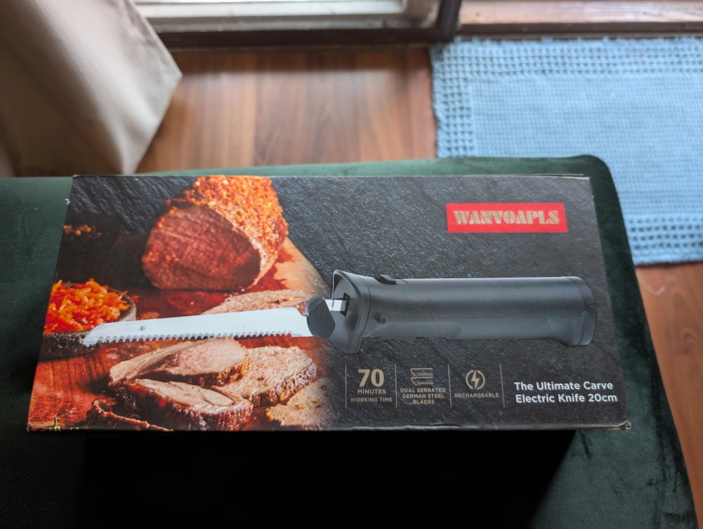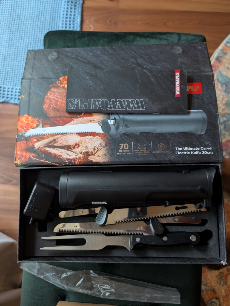Selling a Wanyoapls electric carving knife set. It comes with multiple blades and a fork. The box is included. This ultimate carve electric knife is 20cm.