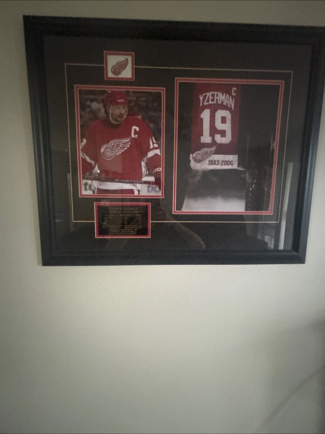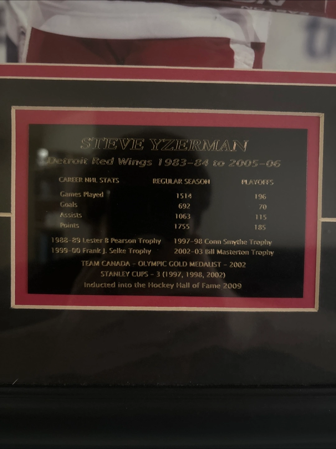 Selling a framed photo and jersey of Steve Yzerman from his time with the Detroit Red Wings! It includes his career NHL stats from 1983-84 to 2005-06, as well as his achievements such as the Lester B. Pearson Trophy, Conn Smythe Trophy, and Olympic Gold Medal