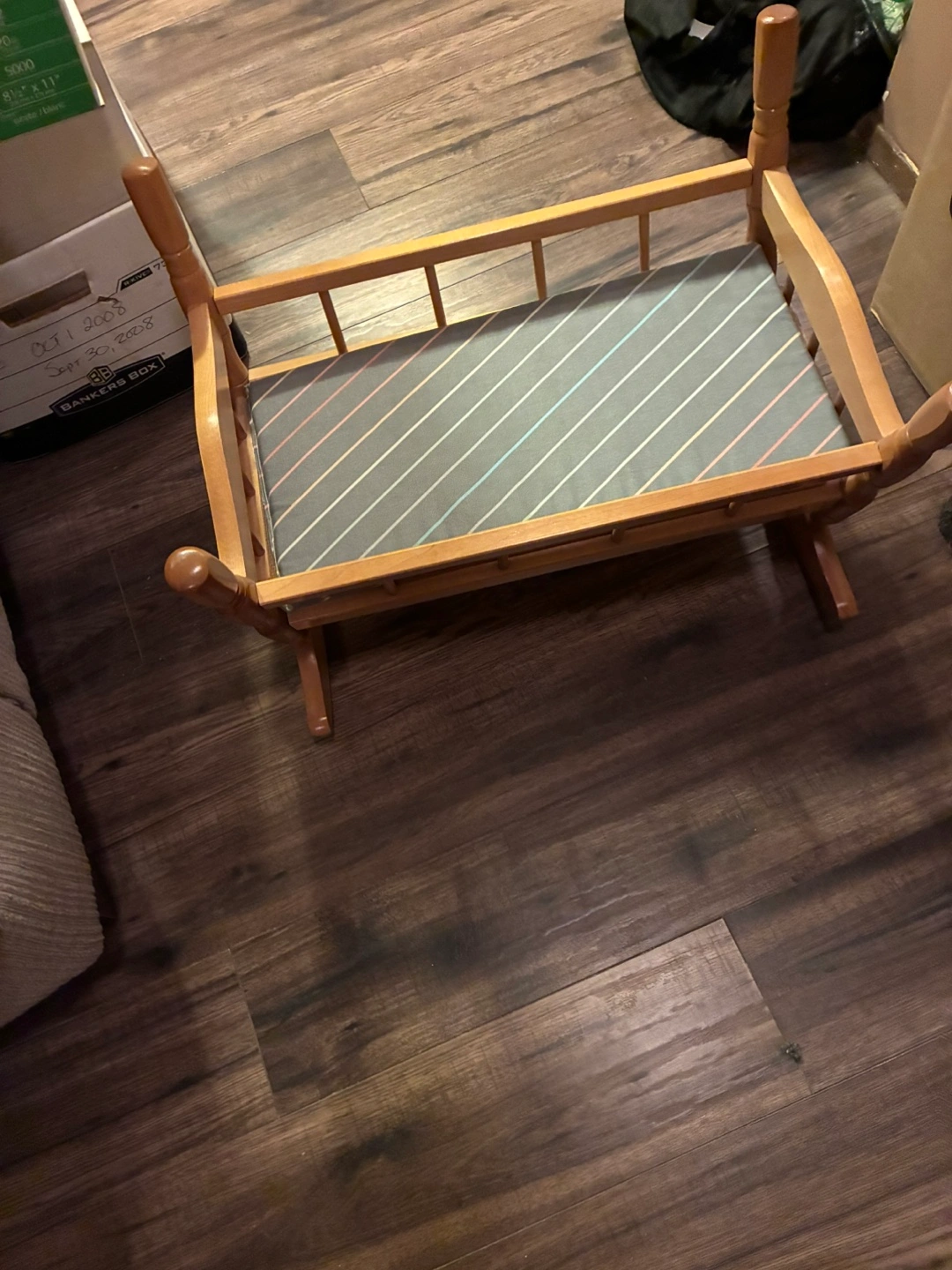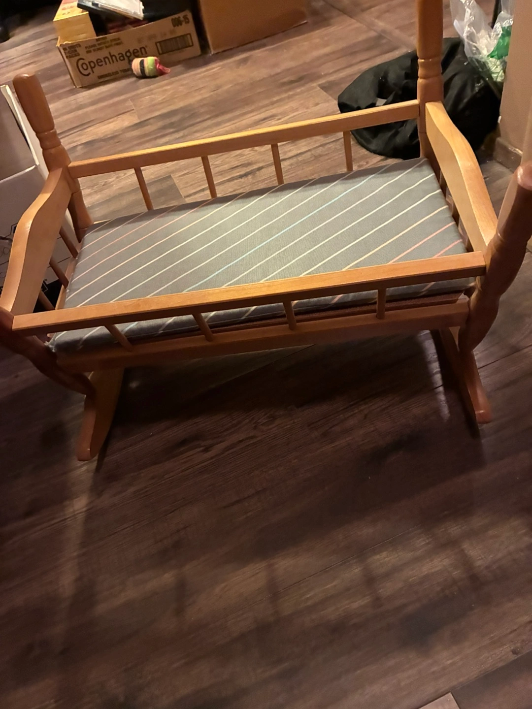 Selling a cute doll cradle that comes with two adorable dolls! The cradle is made of wood and has a striped mattress. The dolls have yarn hair and cute outfits. Great for imaginative play!