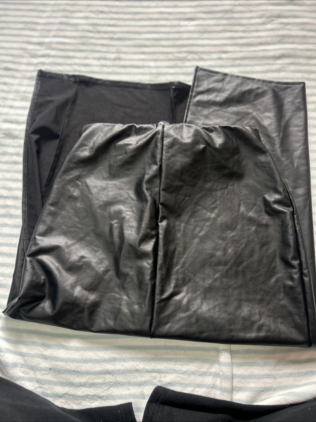 Selling a stylish black faux leather skirt. It's in great condition and perfect for a night out or a chic everyday look! The skirt features a sleek design with a slit.