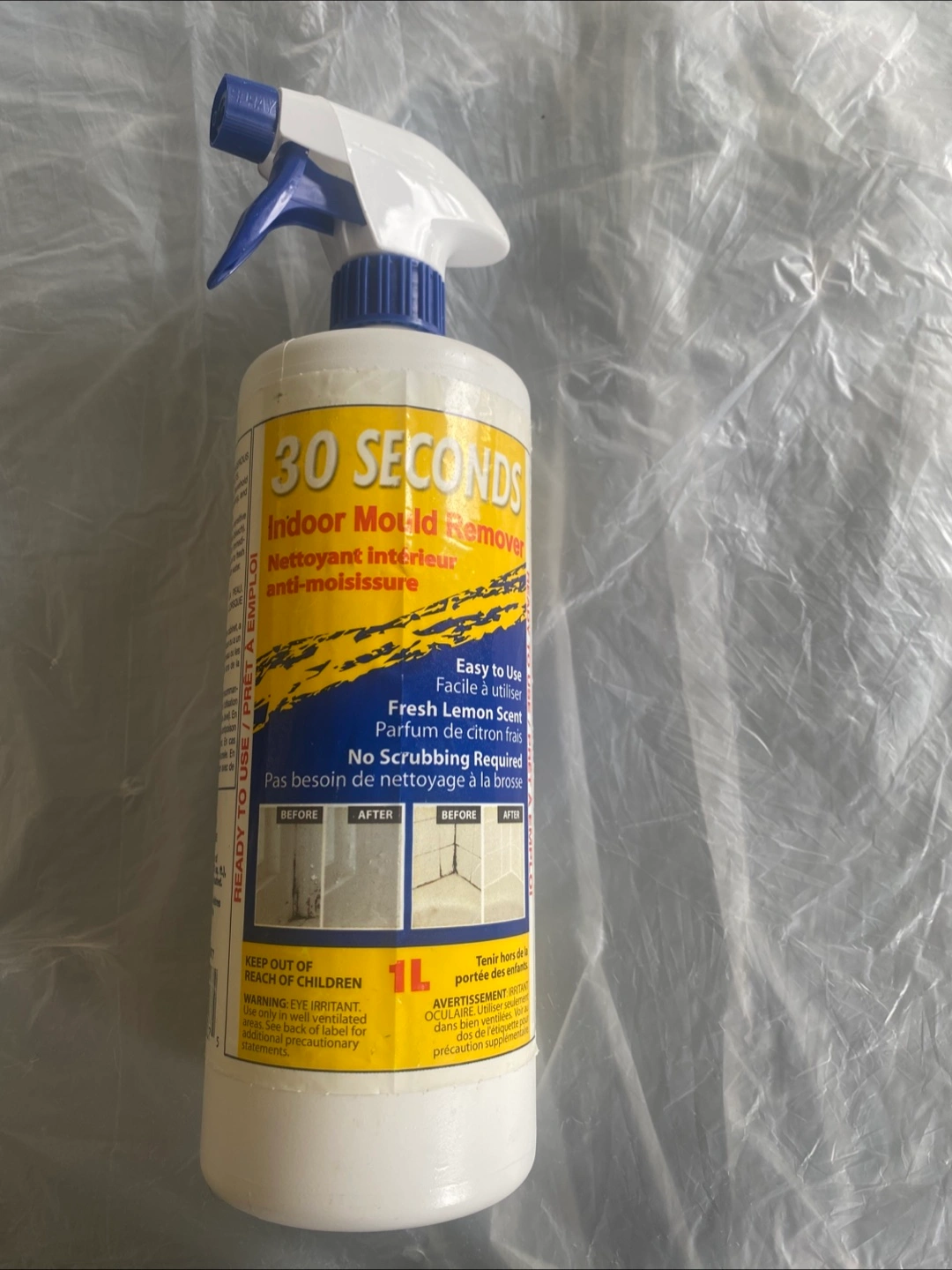 Selling a 1L bottle of 30 Seconds Indoor Mold Remover! It's easy to use and has a fresh lemon scent. No scrubbing is required, making cleaning a breeze! Perfect for removing mold and mildew from tiles, grout, shower doors, vinyl curtains, and more