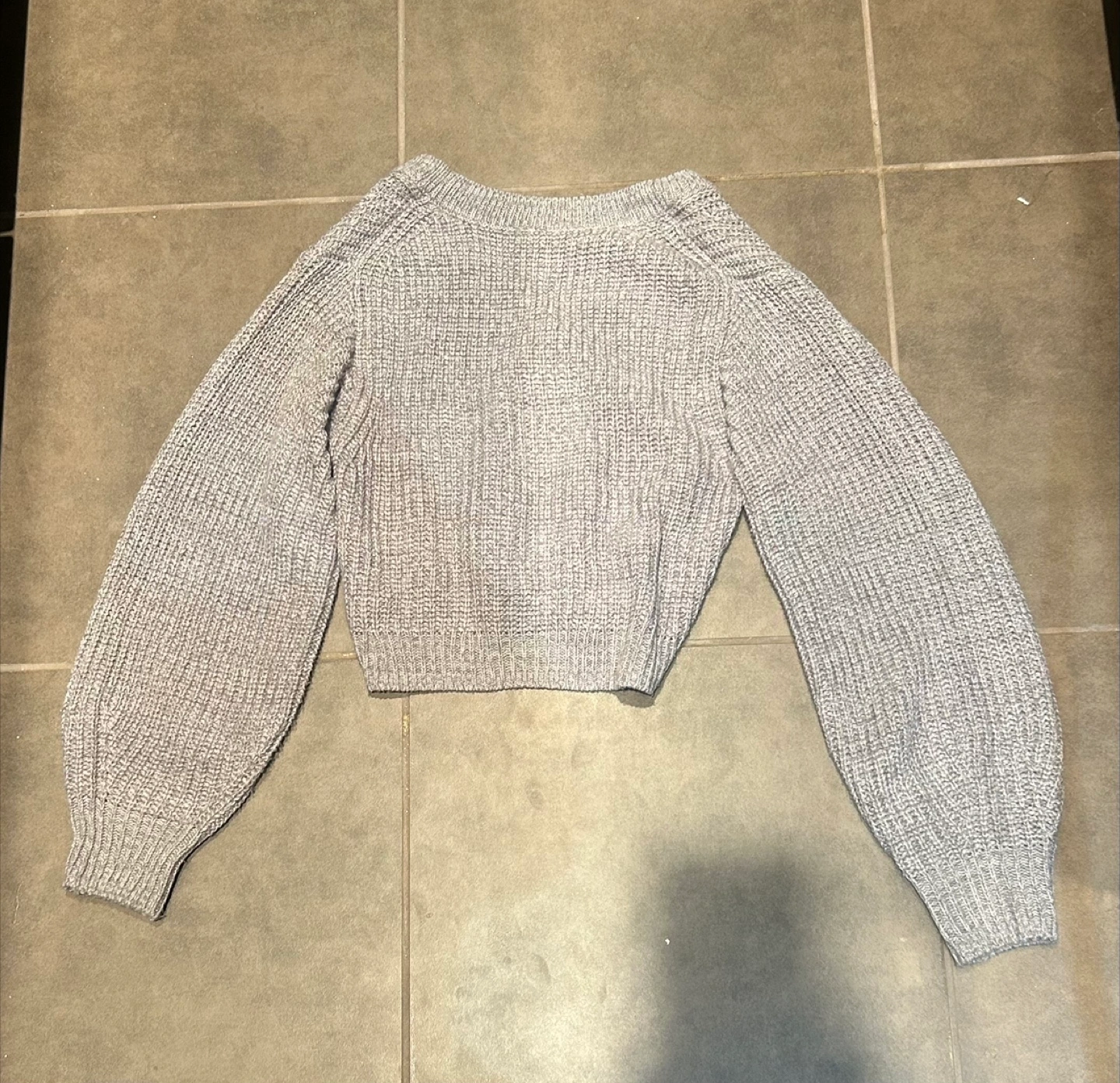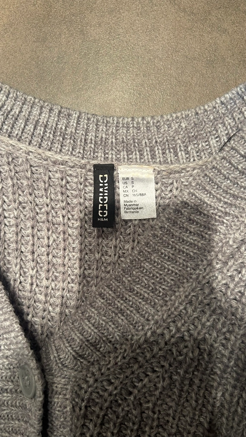 Selling a cute grey knit cardigan from H&M's Divided line! It's a size small and in great condition. Perfect for layering or wearing on its own. The material is soft and cozy, making it ideal for cooler weather. It's a versatile piece that can be dressed up or down!